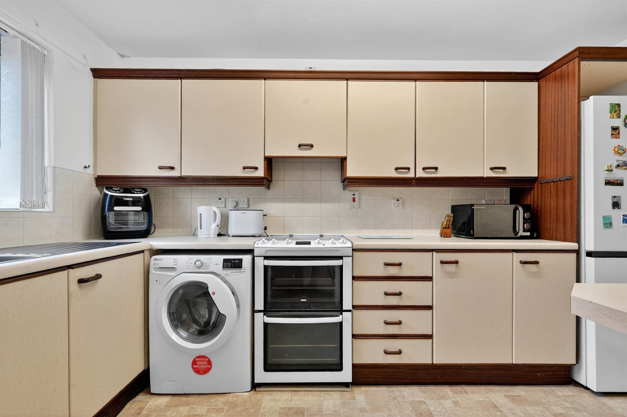 Good range of high and low level units including leaded glass display cabinets. Breakfast bar. Single drainer stainless steel sink unit. Zanussi cooker with extractor fan over. Plumbed or washing machine. Part tiled walls.