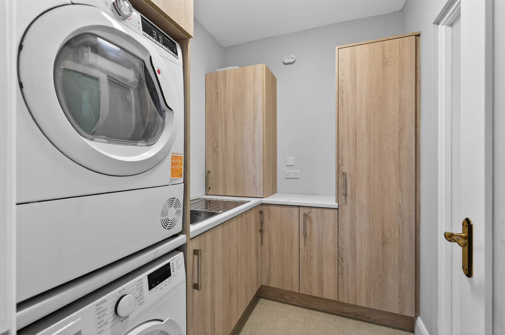High and low level units. Stainless steel sink with mixer tap. Plumbed for washing machine. Space for tumble dryer. Tiled floor.