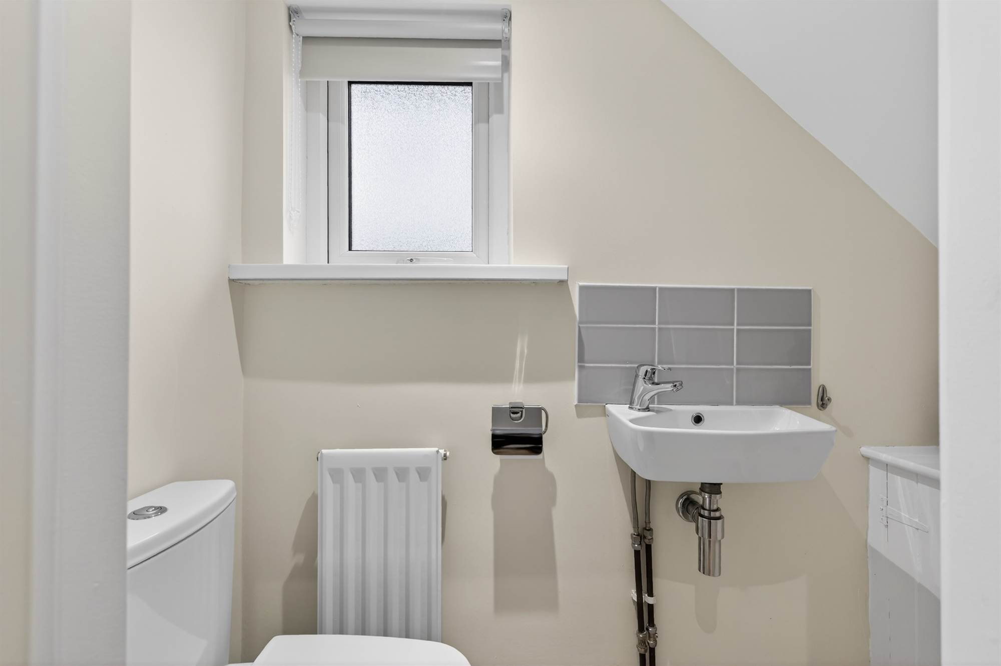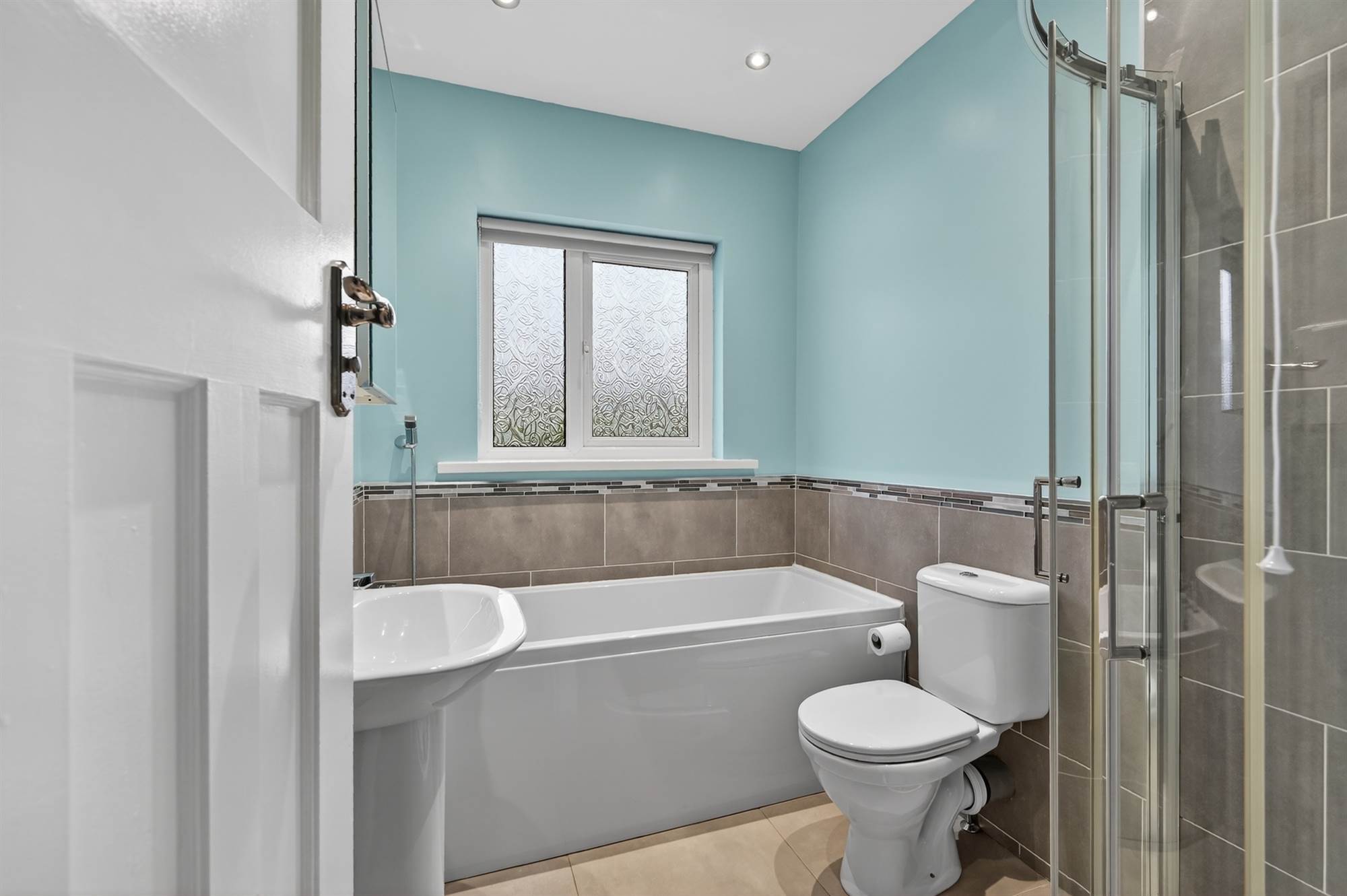 White suite comprising low flush wc. Pedestal wash hand basin with mixer tap. Wall-mounted cabinet. Panelled bath with mixer tap. Chrome heated towel rail. Shower cubicle with drencher shower. Part tiled walls, tiled floor. Spotlights.
