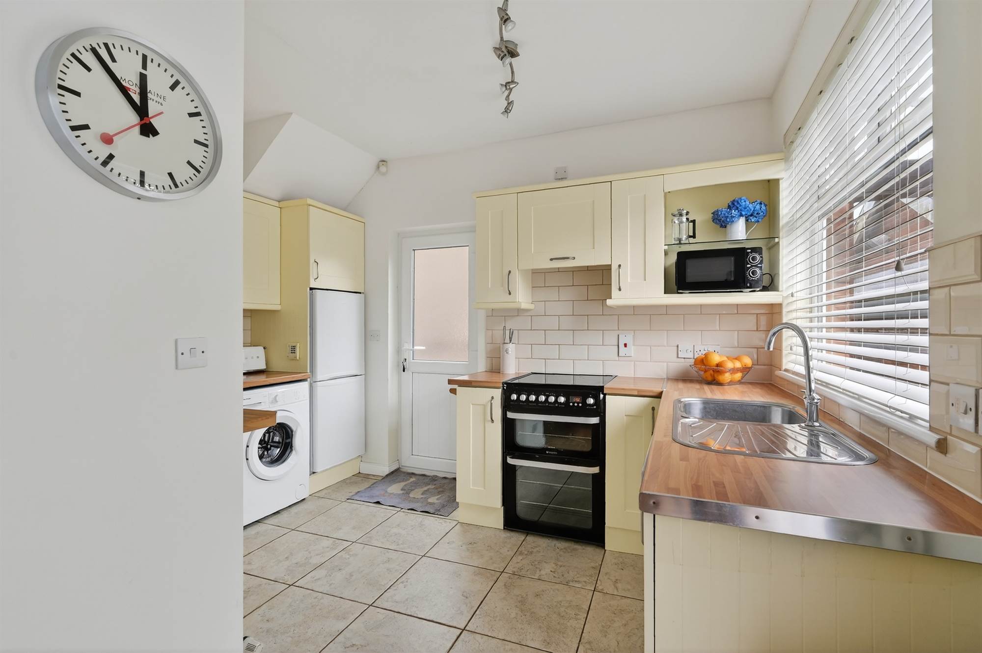 Modern fitted kitchen with range of high and low level units, stainless steel single drainer sink unit, plumbed for washing machine, alcove for cooker, extractor hood. Plumbed for washing machine, part tiled walls, tiled floor, uPVC glazed door to rear.