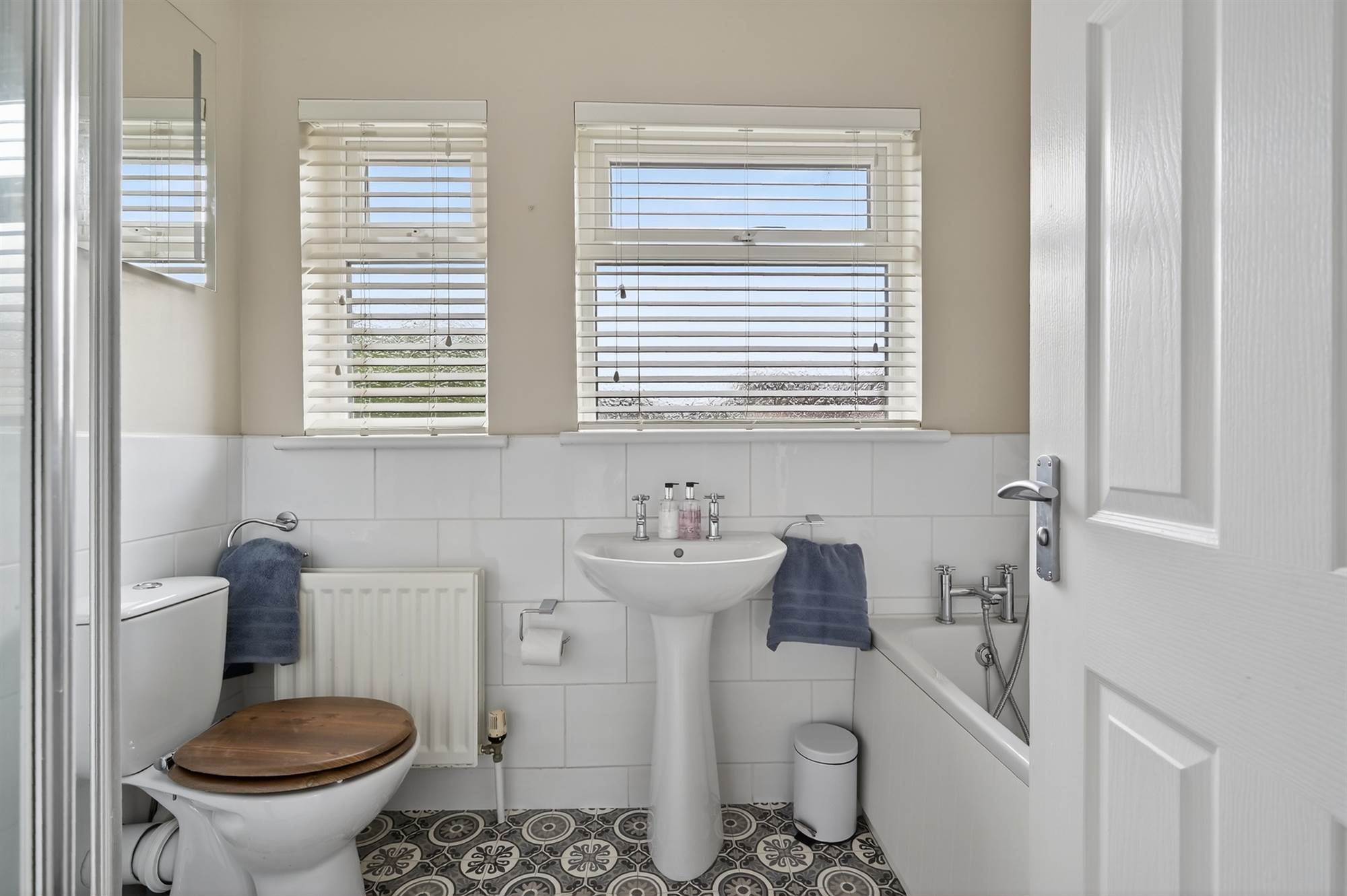 White suite comprising shower cubicle, panelled bath with mixer tap and telephone hand shower, low flush wc, pedestal wash hand basin, part tiled walls, tiled floor.