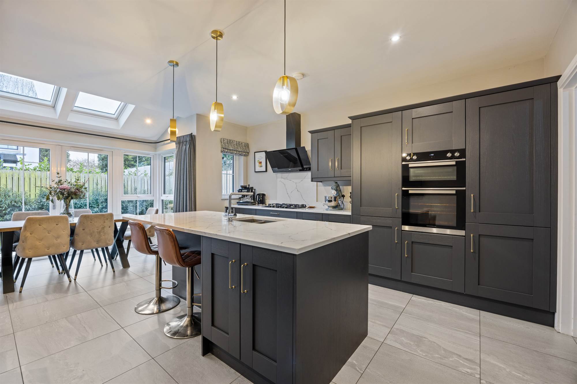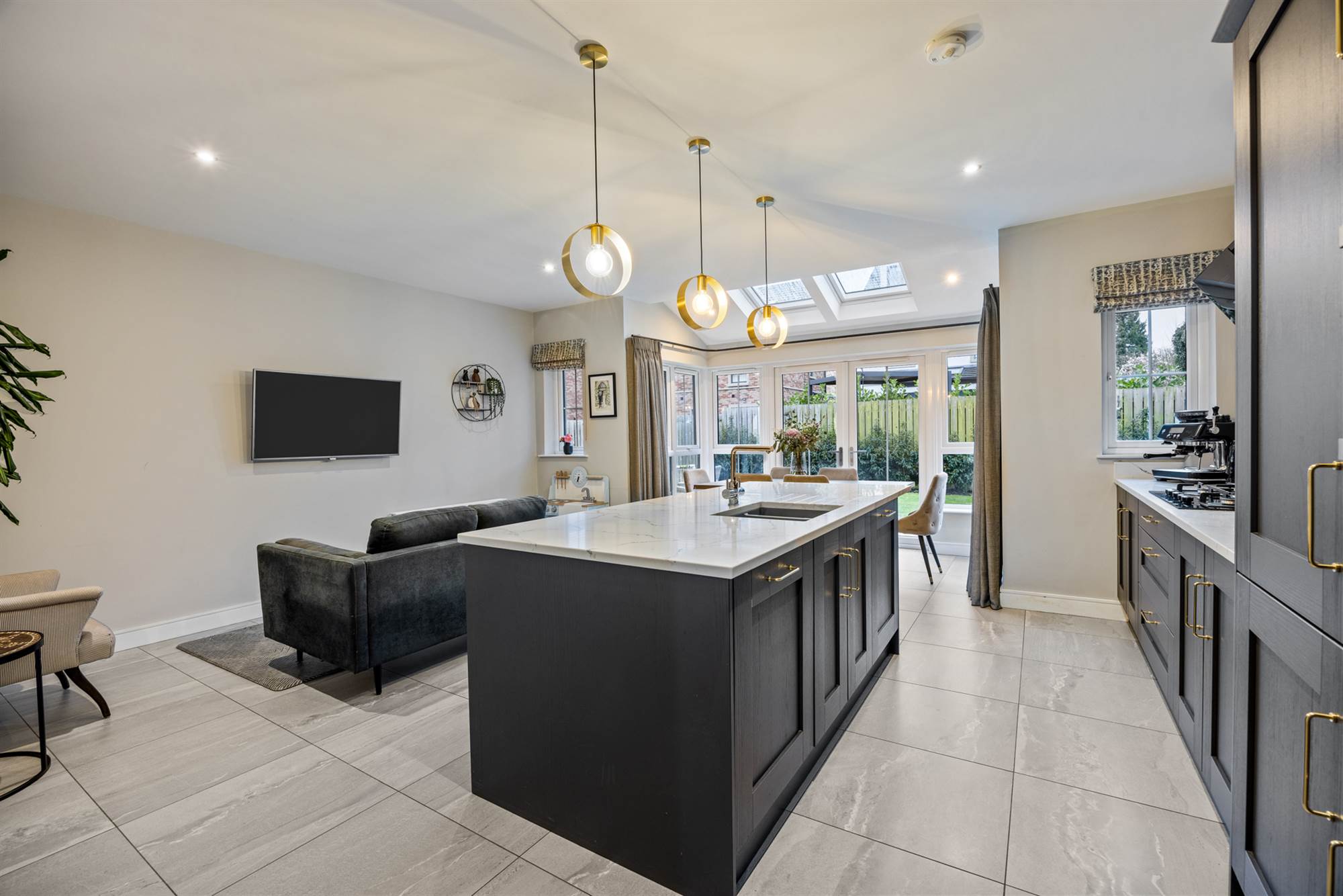 Modern fitted kitchen with range of high and low level units, five ring gas hob, extractor hood. Electric double oven, integrated fridge/freezer, microwave oven, centre island with one and a half bowl sink unit, marble work surfaces, integrated dishwasher, breakfast bar area. Casual dining area, living area with glazed double doors to rear. Tiled floor, low voltage spotlights, Velux window.
