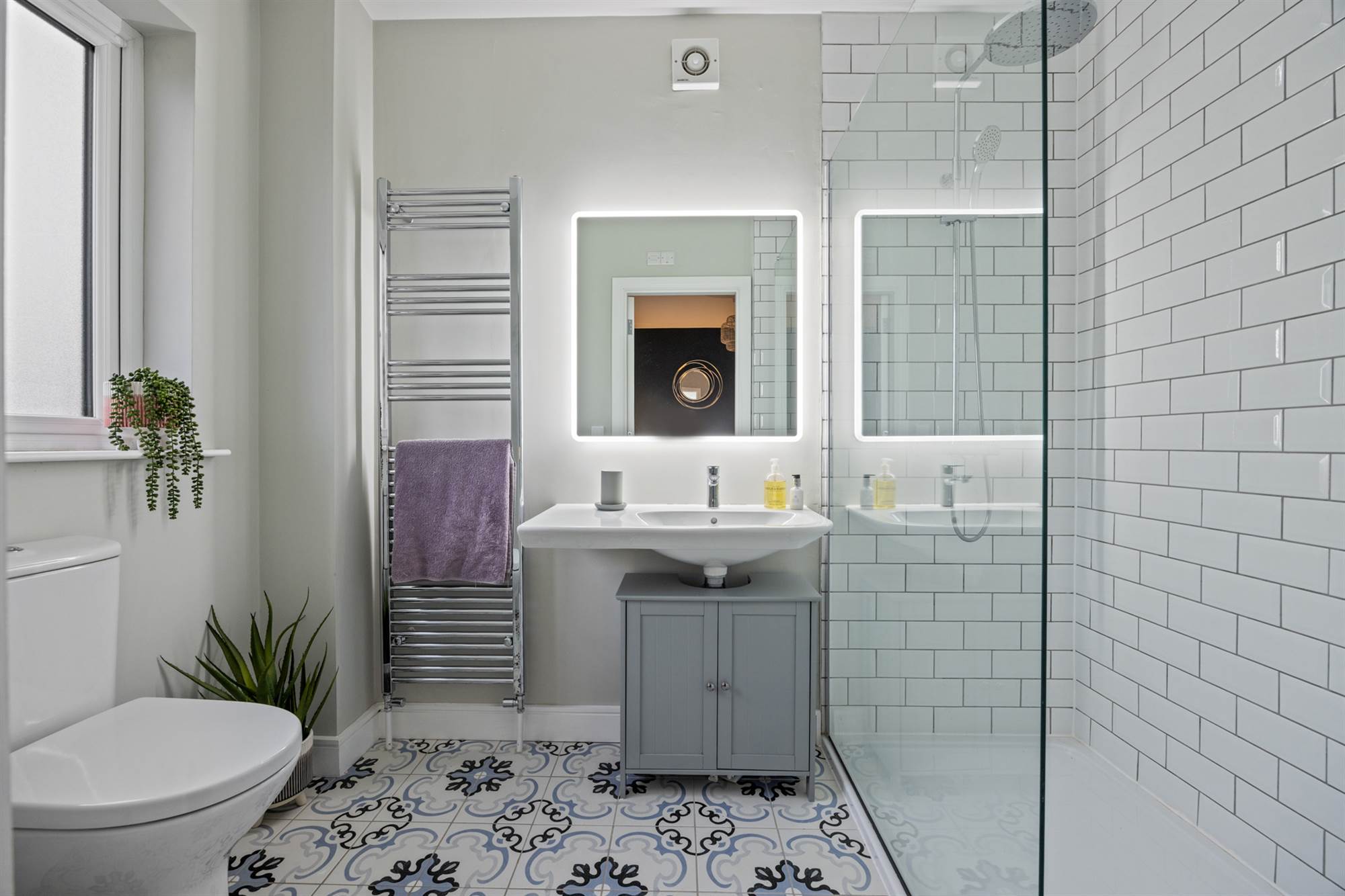 White suite comprising walk-in shower cubicle, wash hand basin, low flush wc, tiled floor, part tiled walls, chrome heated towel rail, work surfaces.