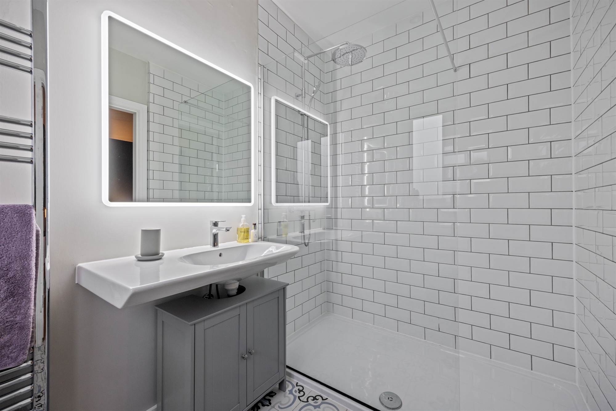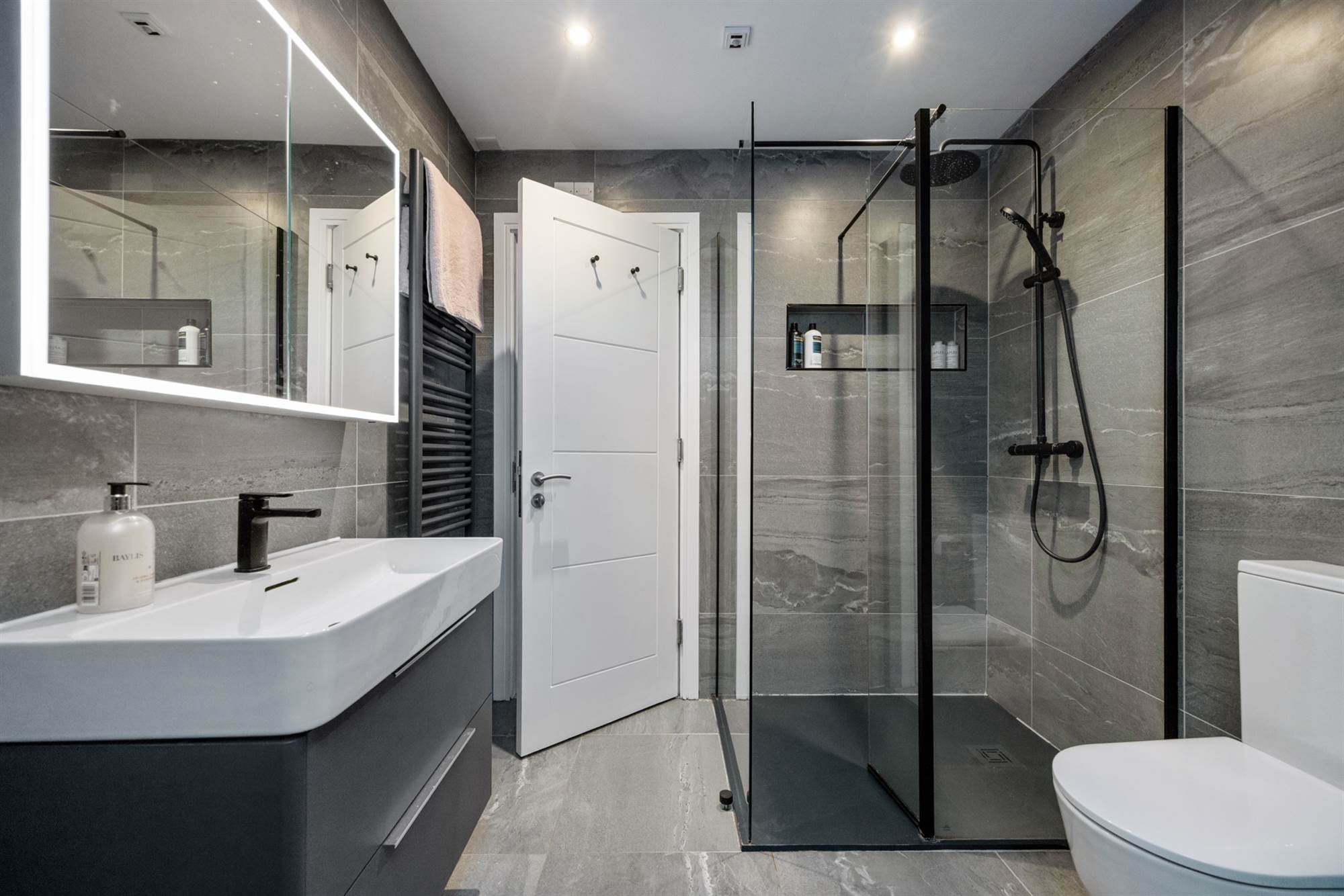 Contemporary white suite comprising shower cubicle, vanity sink unit, low flush wc, fully tiled walls, tiled floor, heated towel rail, Velux window.
