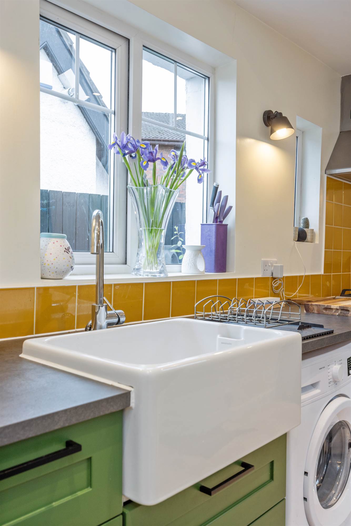 Single drainer 1.5 stainless steel sink unit with mixer taps. Excellent range of high and low level units with stainles steel door furniture. Built in stainless steel oven and 4 ring gas hob, stainless steel chimney extractor fan. Ample work surfaces, corner display shelving. Plumbed for washing machine. Partially tiled walls. Breakfast bar. Natural slate floor. Integrated fridge and freezer. Pelmut lighting. Low voltage lighting.
