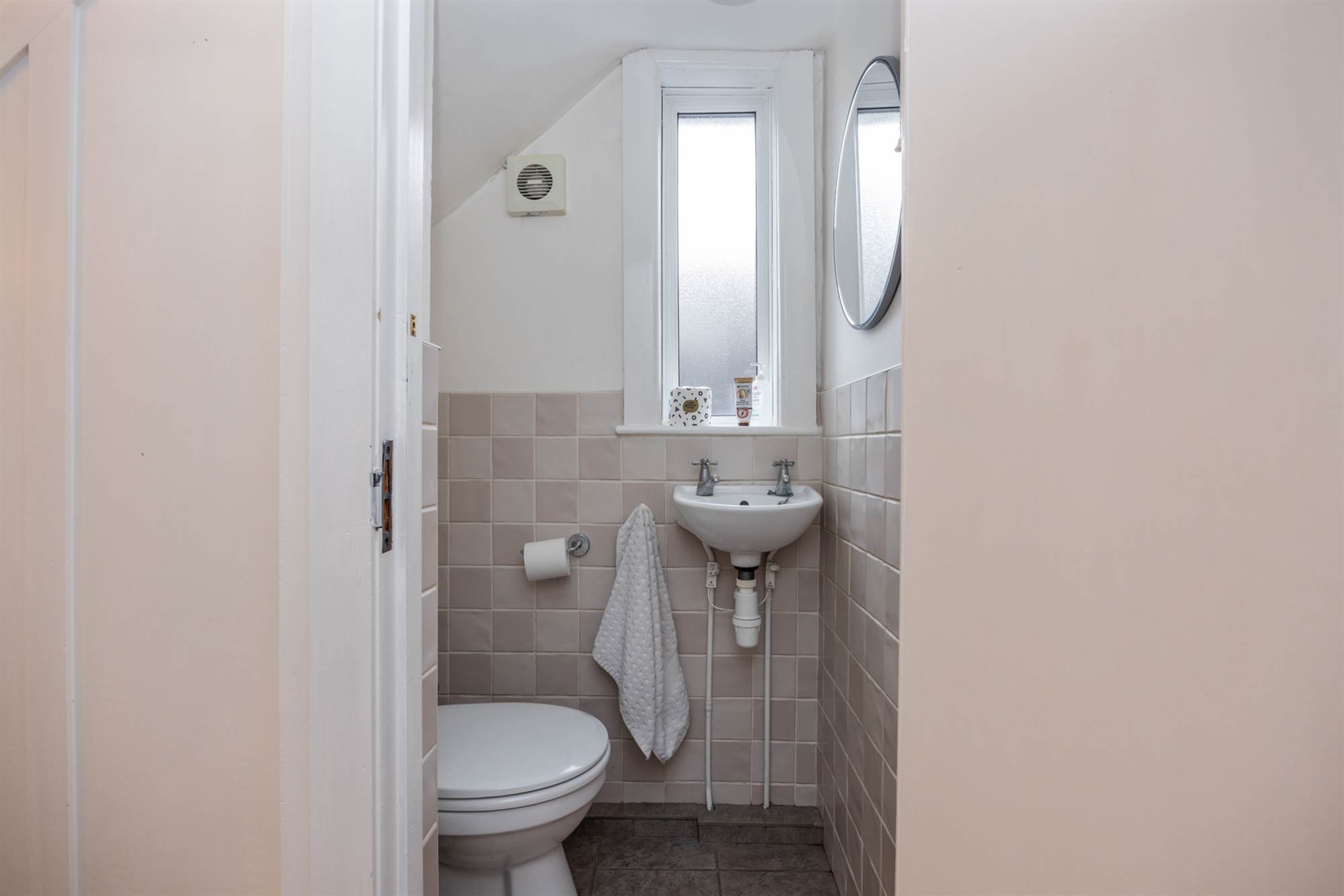 White suite, low flush WC, wash hand basin, ceramic tiled floor, extractor fan.