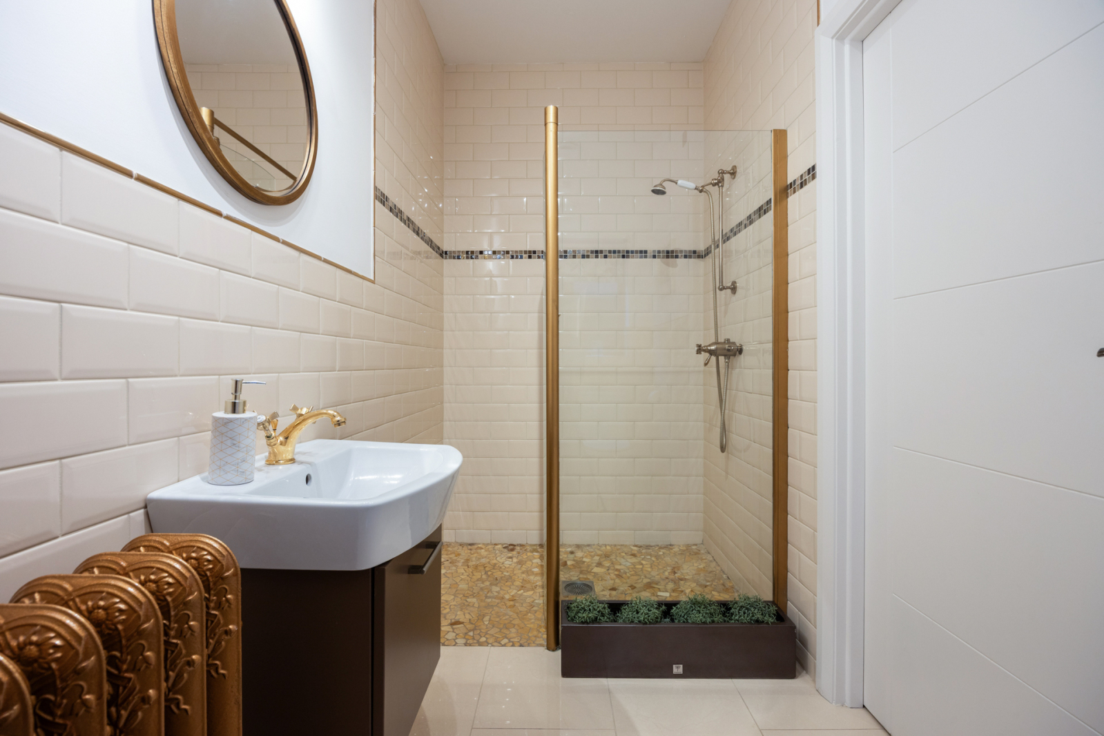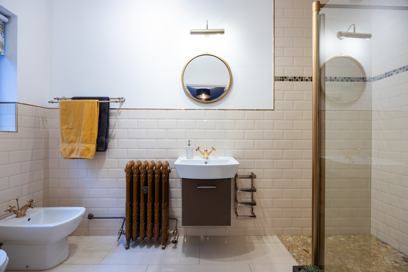 White suite comprising of low flush WC, floating wash hand basin with mixer tap, storage below, bidet with hot and cold tap, walk-in thermostatically controlled shower, partly tiled walls, tiled flooring, extractor fan.