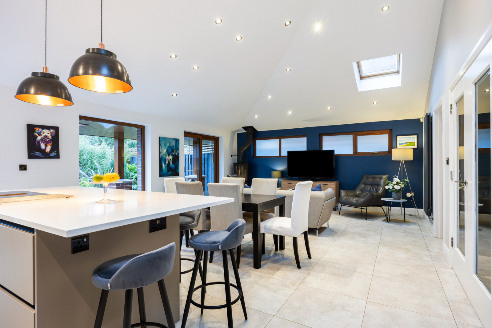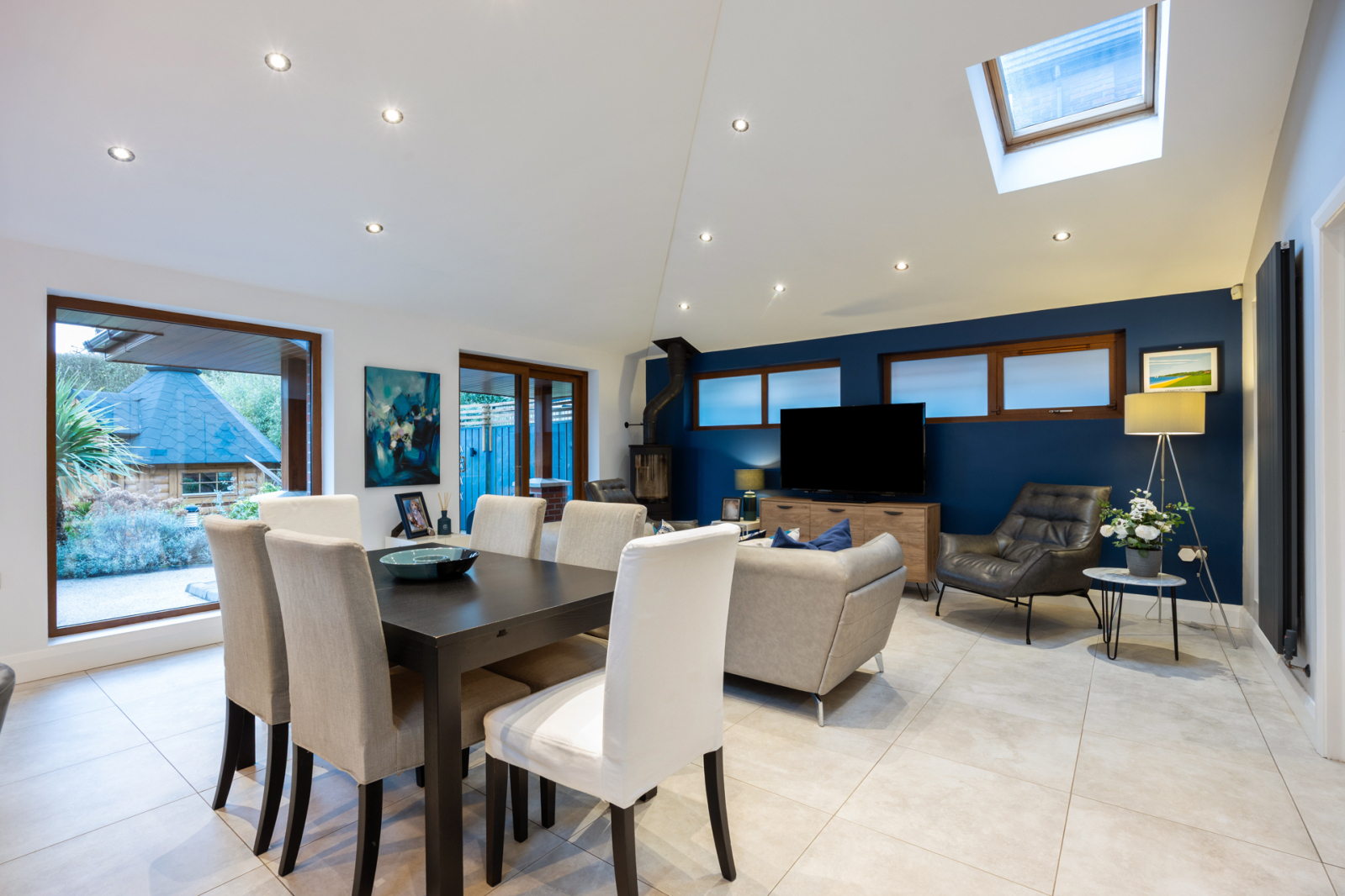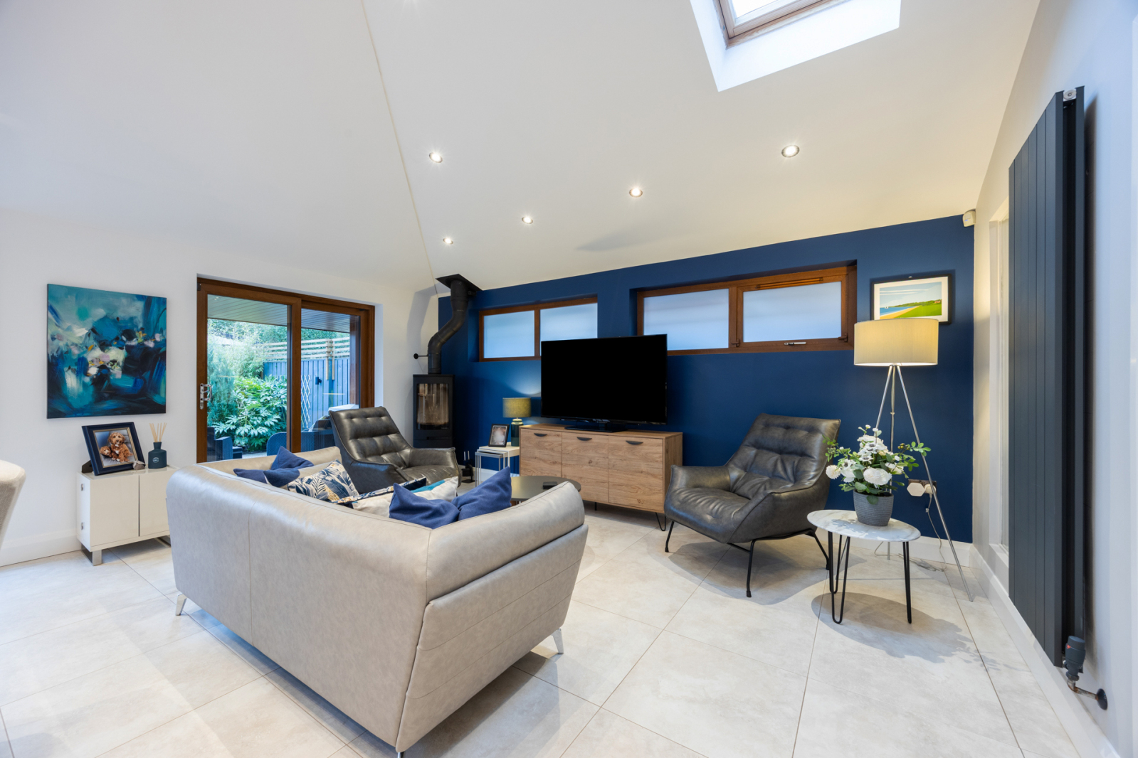 Fantastic range of high and low level units, quartz work surface with inset sink unit and drainer, instant hot water Quooker tap, integrated fridge freezer, integrated double AEG ovens, integrated dishwasher, integrated bins, island unit with quartz work surface, induction hob with integrated extractor fan, casual dining, wine fridge, open plan to living/dining area with wood burning stove, large feature picture frame style window, tiled flooring throughout, recessed spotlighting, two Velux windows, two sliding uPVC doors leading through to rear garden, access through to study / playroom.