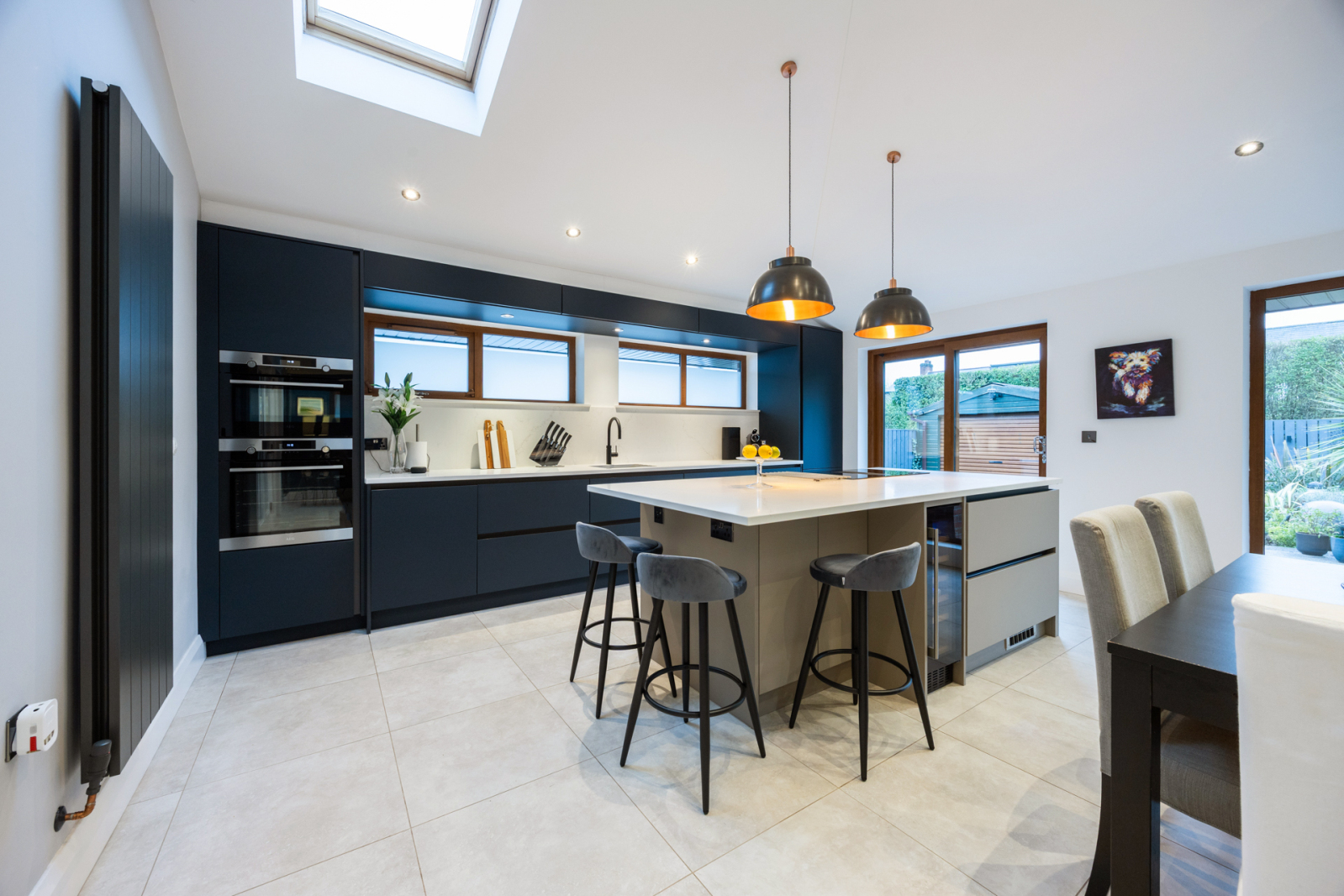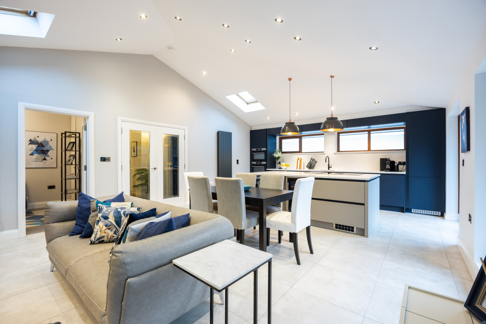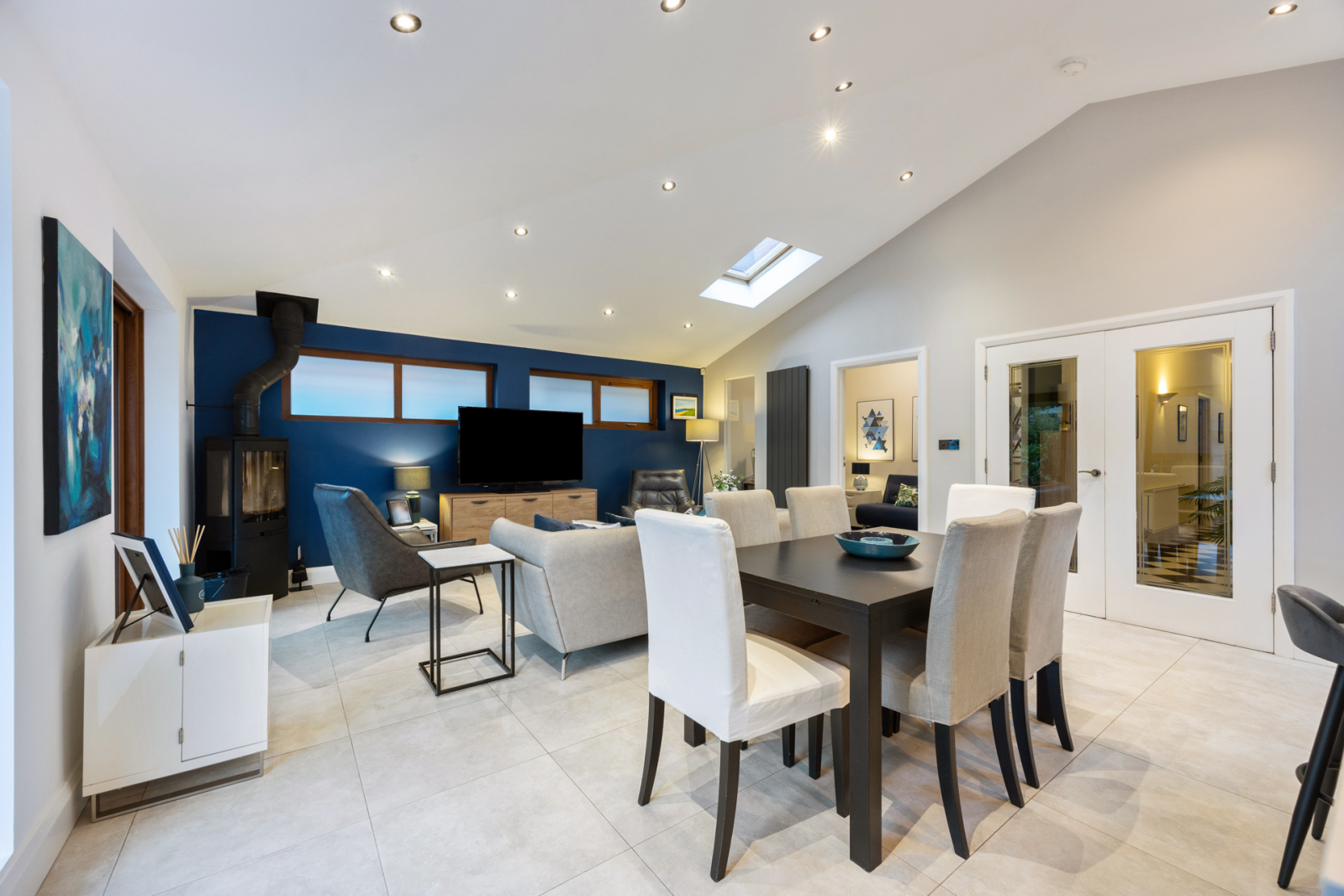 Fantastic range of high and low level units, quartz work surface with inset sink unit and drainer, instant hot water Quooker tap, integrated fridge freezer, integrated double AEG ovens, integrated dishwasher, integrated bins, island unit with quartz work surface, induction hob with integrated extractor fan, casual dining, wine fridge, open plan to living/dining area with wood burning stove, large feature picture frame style window, tiled flooring throughout, recessed spotlighting, two Velux windows, two sliding uPVC doors leading through to rear garden, access through to study / playroom.