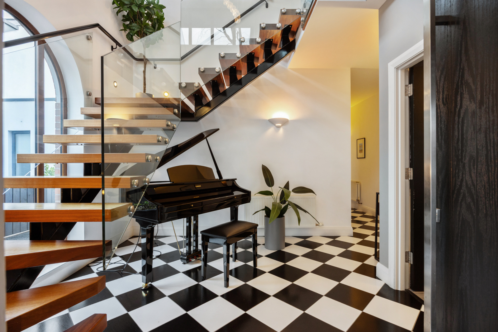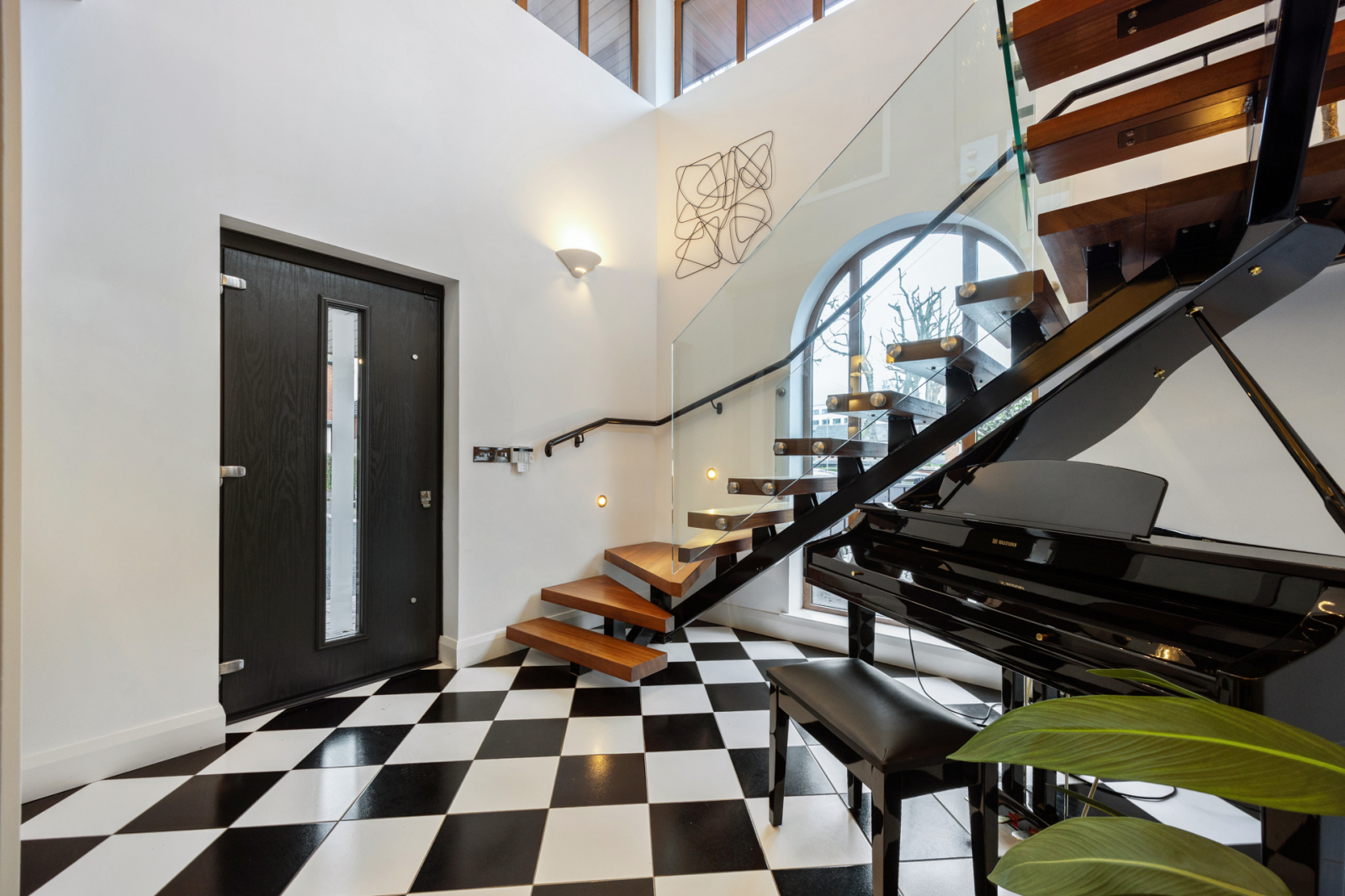 Tiled flooring, feature arch window, Velux window. Wood, metal and glass staircase to upper landing.
