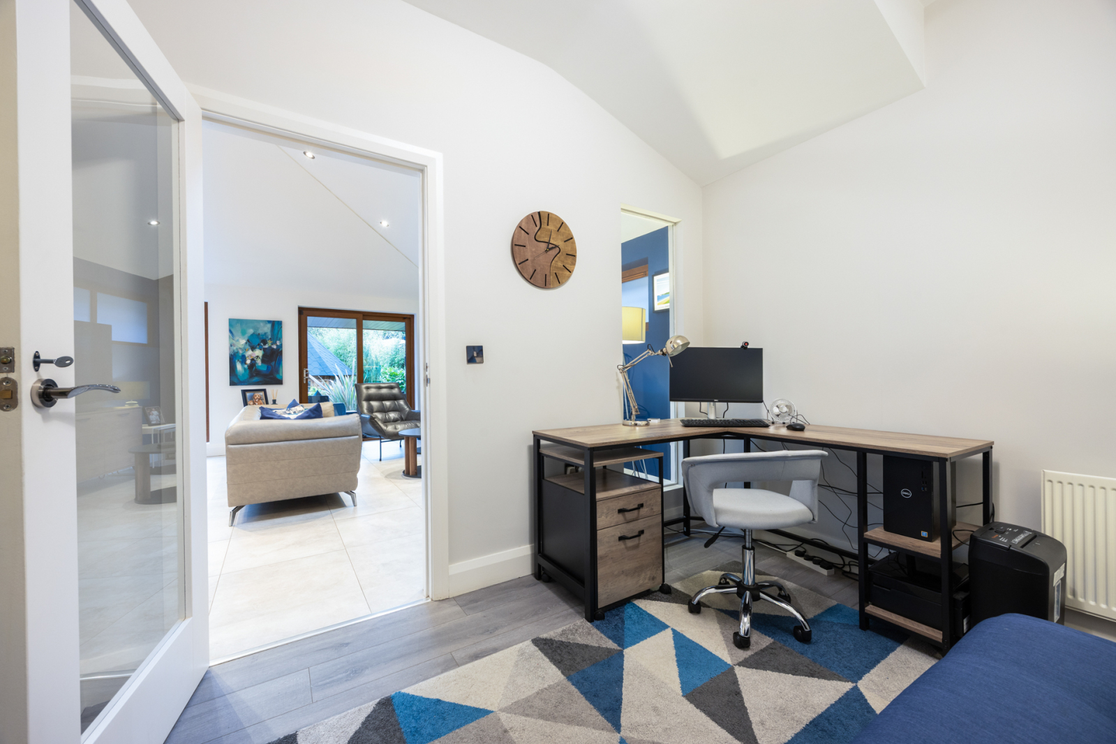 Internally, the ground floor comprises of a bright and welcoming entrance hall that leads to the living room, featuring an open fireplace. The heart of the home is the superb open-plan kitchen / living / dining area. The contemporary kitchen is fitted with an excellent range of integrated appliances and provides access to both a separate home office / playroom and the rear garden, making it an ideal space for everyday living and entertaining. A separate utility room adds further practicality.