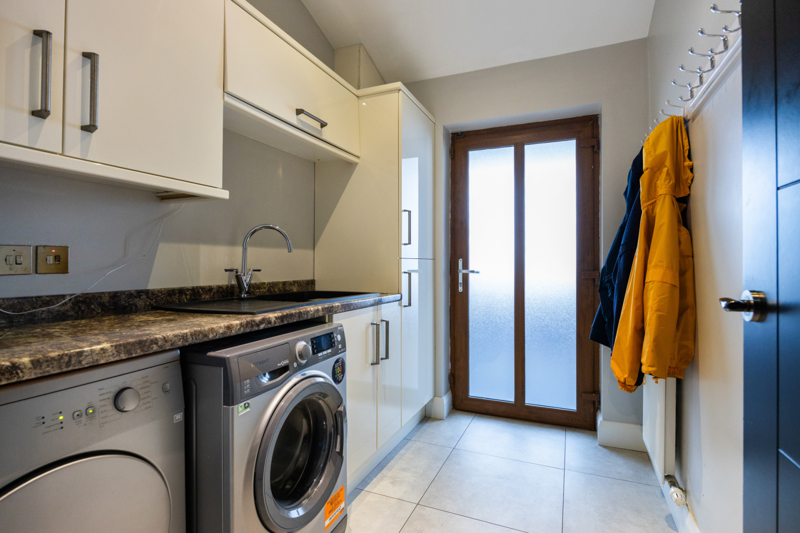 Range of high and low level units, laminate work surface with sink unit and drainer, 1 tub with mixer tap, Vaillant combi boiler, space for tumble dryer, plumbed for washing machine, tiled flooring, recessed spotlighting, extractor fan, access door to side.