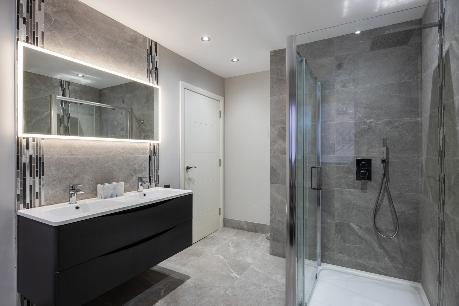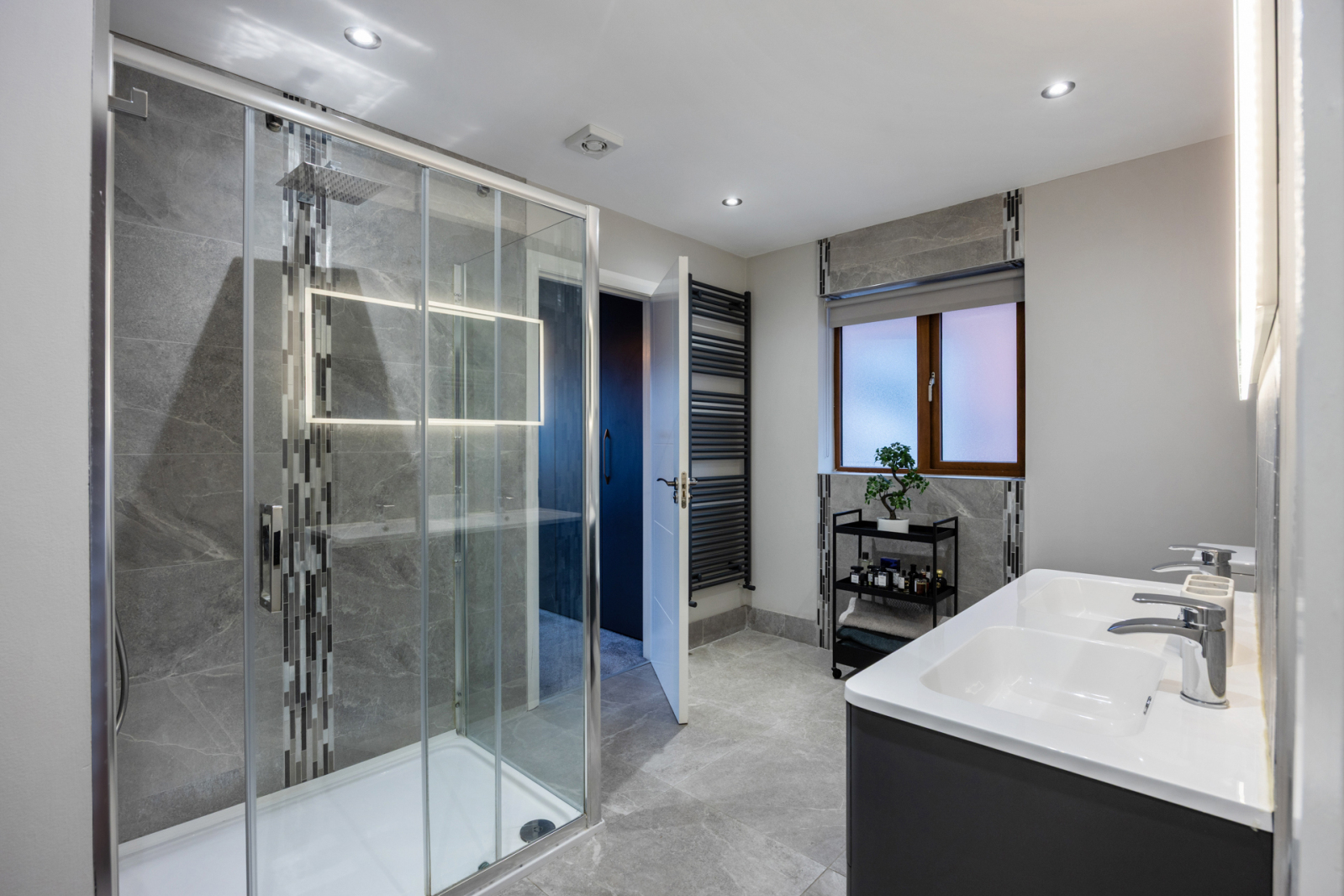 White suite comprising of low flush WC, double wash hand basin with mixer tap, storage below, walk-in thermostatically controlled shower with rainfall shower head and handset, partly tiled walls, tiled flooring, recessed spotlighting, extractor fan, anthracite vertical heated towel rail.