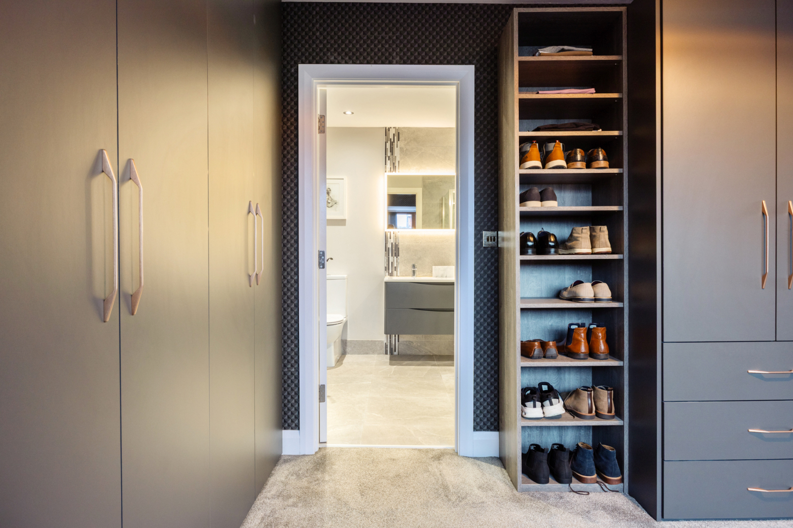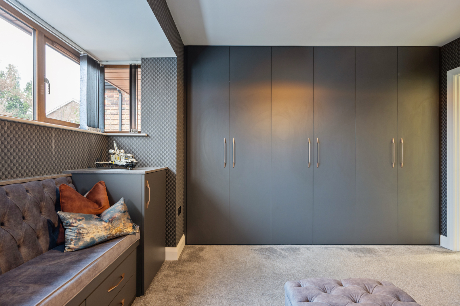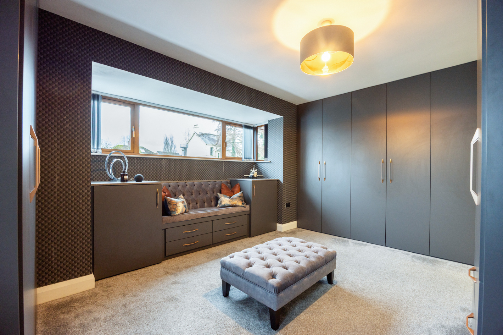 Fantastic range of inbuilt wardrobes, seating area with shelving, outlook to rear.