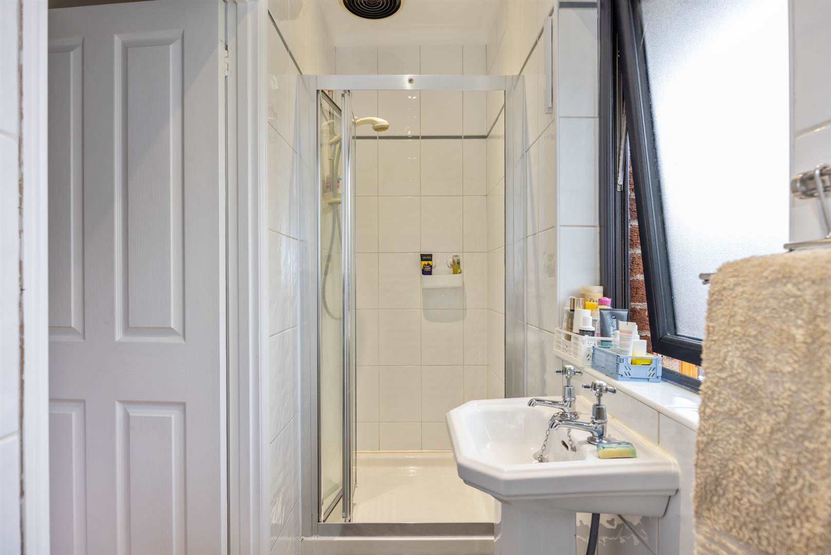 Fully tiled shower cubicle with Mira electric shower, pedestal wash hand basin, low flush wc, ceramic tiled floor, fully tiled walls.