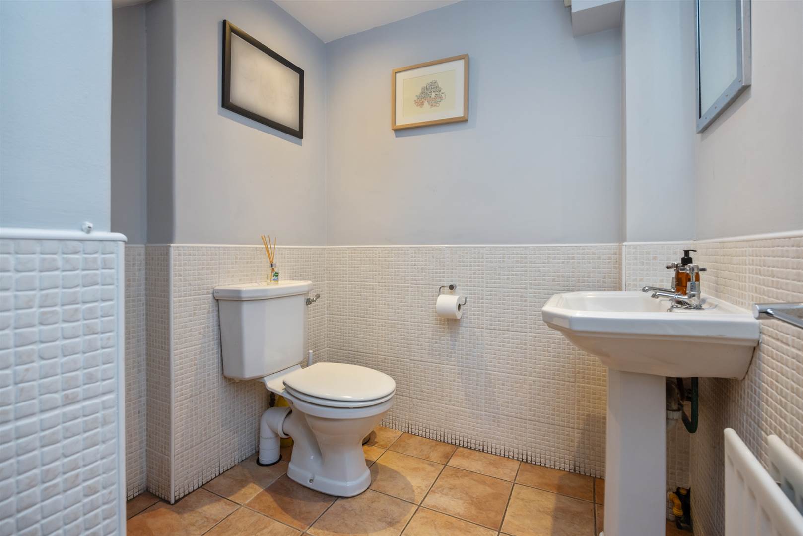 Low flush wc, pedestal wash hand basin, partly tiled walls, ceramic tiled floor, low voltage lighting, extractor fan.