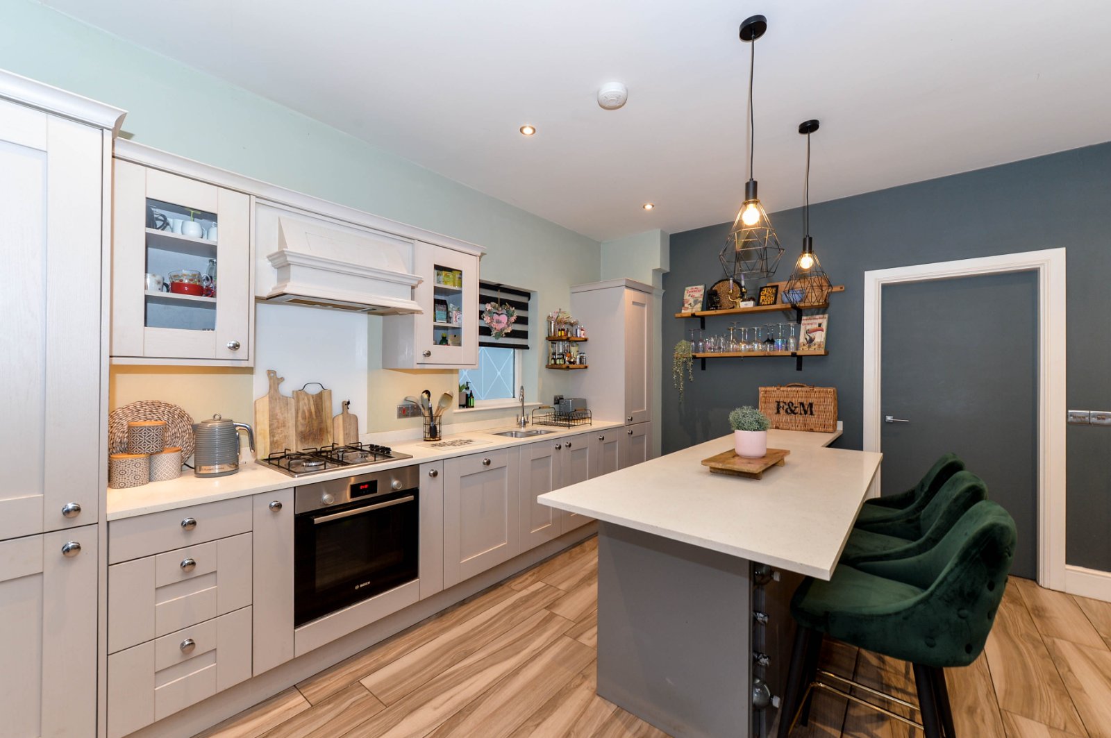 At widest points. One and 1/2 bowl sink unit with chrome dual mixer tap. Excellent range of high and low level soft closing units with laminated work surfaces, up stand and stainless steel door furniture. Integrated four ring gas hob and built in oven with integrated extractor hood. Integrated dishwasher. Integrated fridge / freezer. Built in larder cupboard. Built in storage with gas fired boiler. Wine rack. Glazed display cabinet. Island unit with breakfast bar and feature down lighting. Ceramic tiled flooring. Recessed spotlighting. Ample dining area. Bespoke built in furniture. uPVC French doors to enclosed rear garden.
