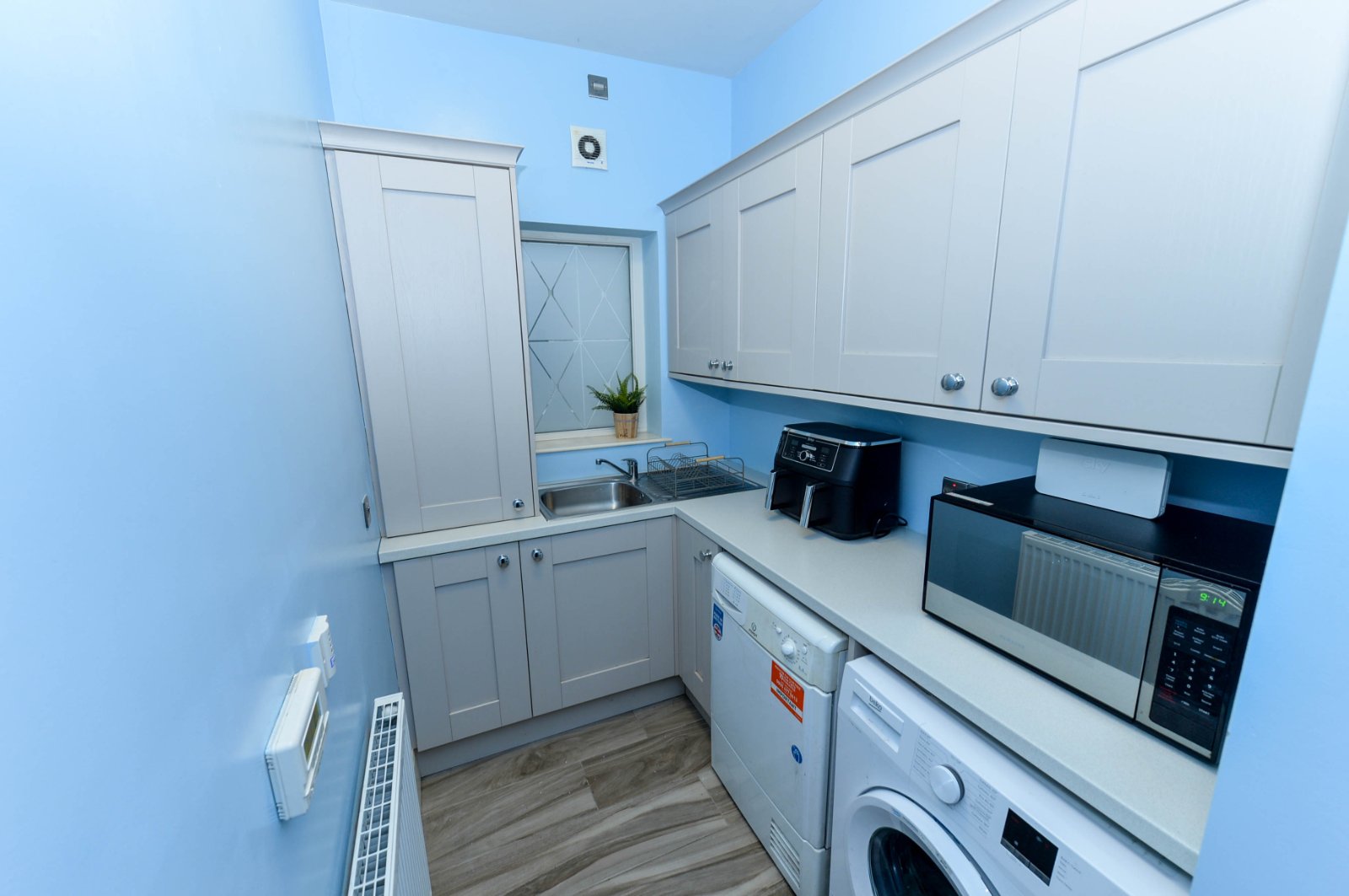 One bowl sink unit with chrome dual mixer tap. Excellent range of high and low level units with formica work surfaces and stainless steel door furniture. Plumbed for washing machine. Space for tumble dryer.