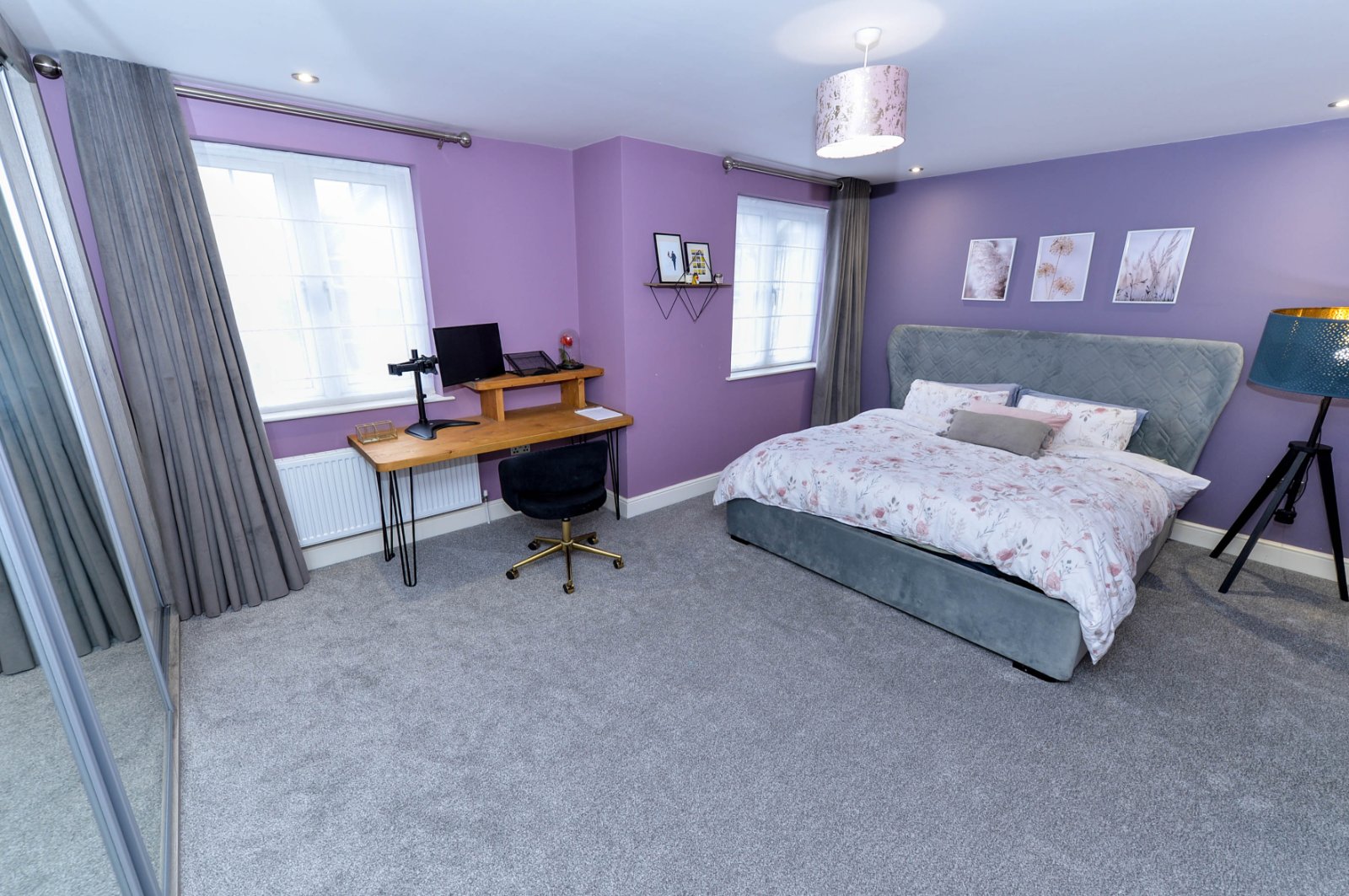 Bespoke custom made desk. Recessed spotlighting. Wall to wall, floor to ceiling built in sliding wardrobes.