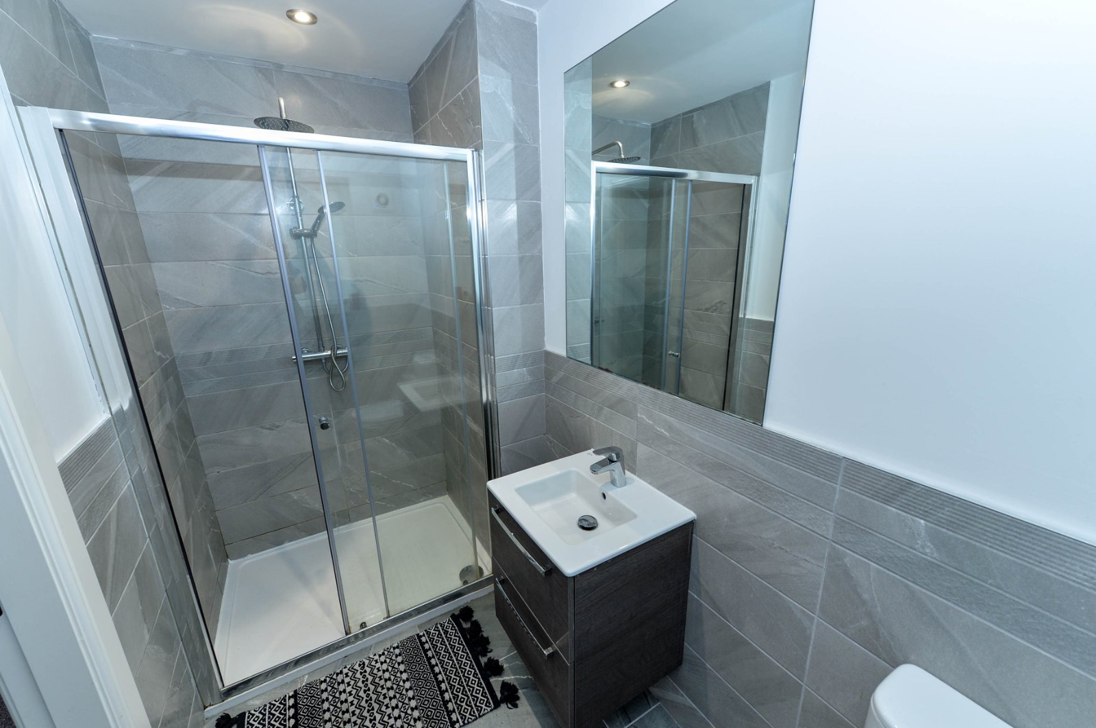 Comprising fully tiled corner shower cubicle with thermostatically controlled shower unit with telephone hand shower. Semi pedestal wash hand basin with chrome dual mixer tap. Dual flush w/c. Partly tiled walls. Ceramic tiled flooring. Recessed spotlighting. Chrome heated towel rail. Extractor fan.