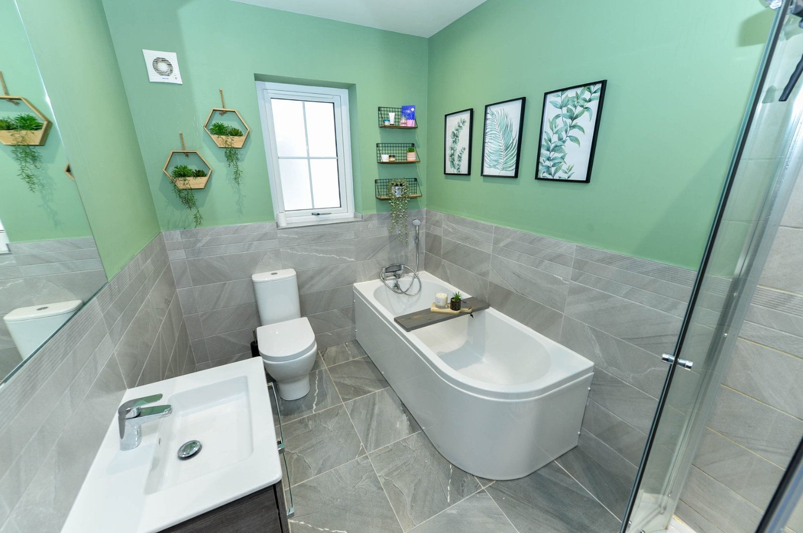 Comprising panelled bath with chrome dual mixer tap and telephone hand shower/ Fully tiled corner shower cubcile with thermostatically controlled shower unit with telephone hand shower and overhead drencher. Floating vanity unit with inset sink and chrome dual mixer tap. Dual flush w/c. Partly tiled walls. Ceramic tiled flooring. Chrome heated towel rail. Recessed spotlighting. Extractor fan.