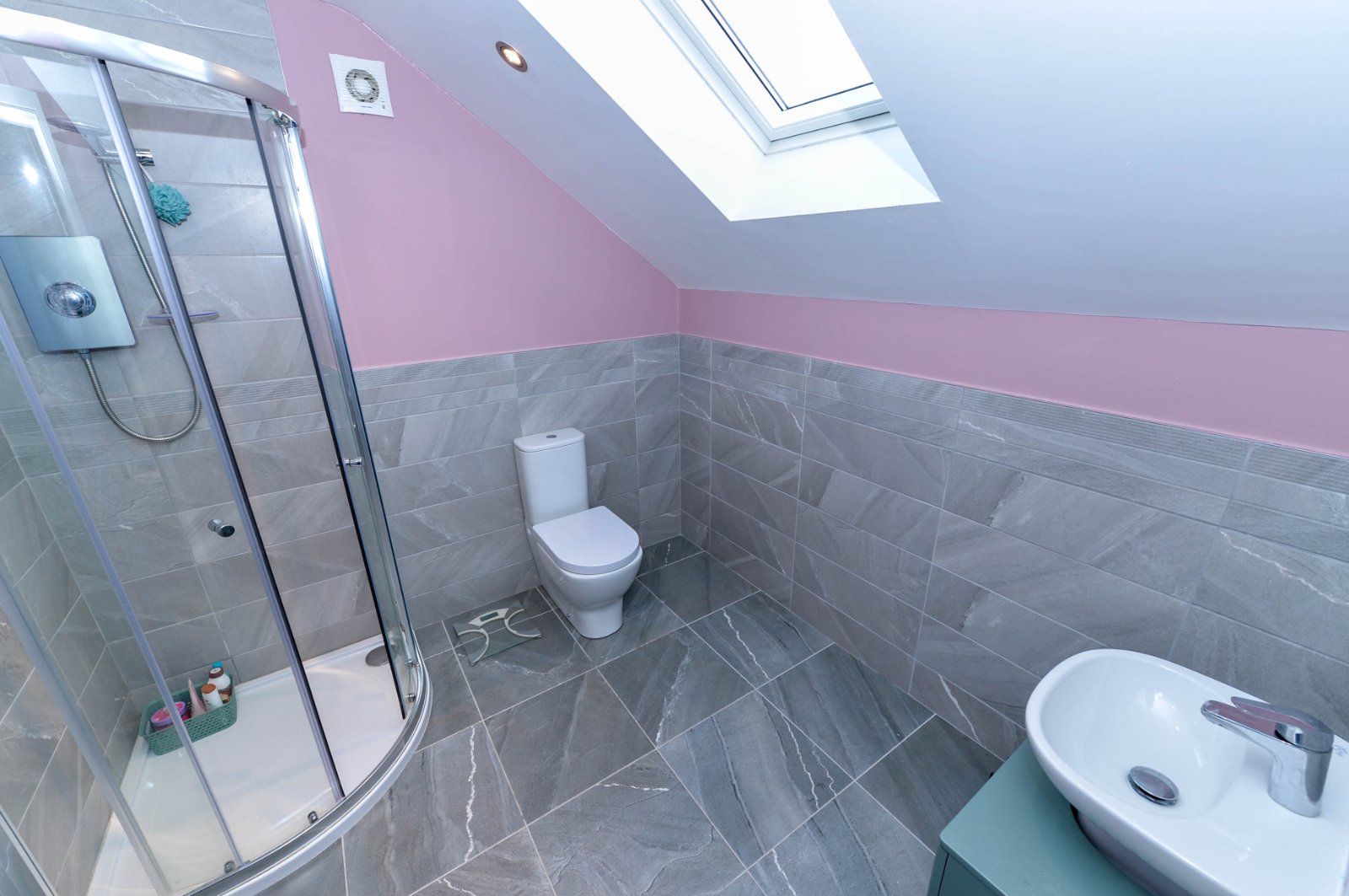 Comprising fully tiled corner shower cubicle with electric shower unit. Pedestal wash hand basin with chrome dual mixer tap. Dual flush w/c. Partly tiled walls. Ceramic tiled flooring. Extractor fan. Recessed spotlighting. Velux window.