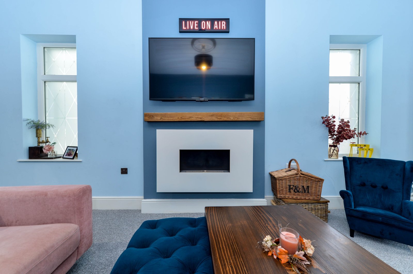 Into square bay. Feature wall mounted gas fire with floating oak mantle. Recessed spotlighting.