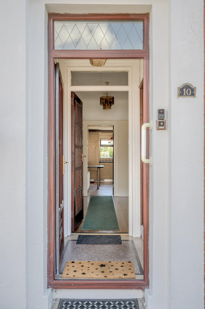 With terrazzo flooring, hardwood glazed vestibule door into entrance hall.