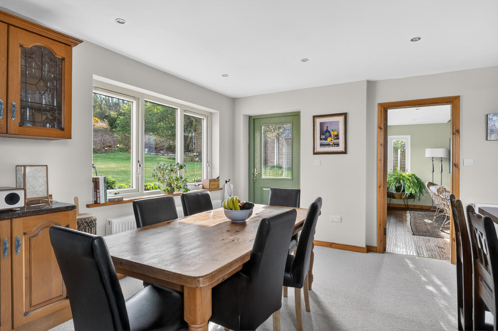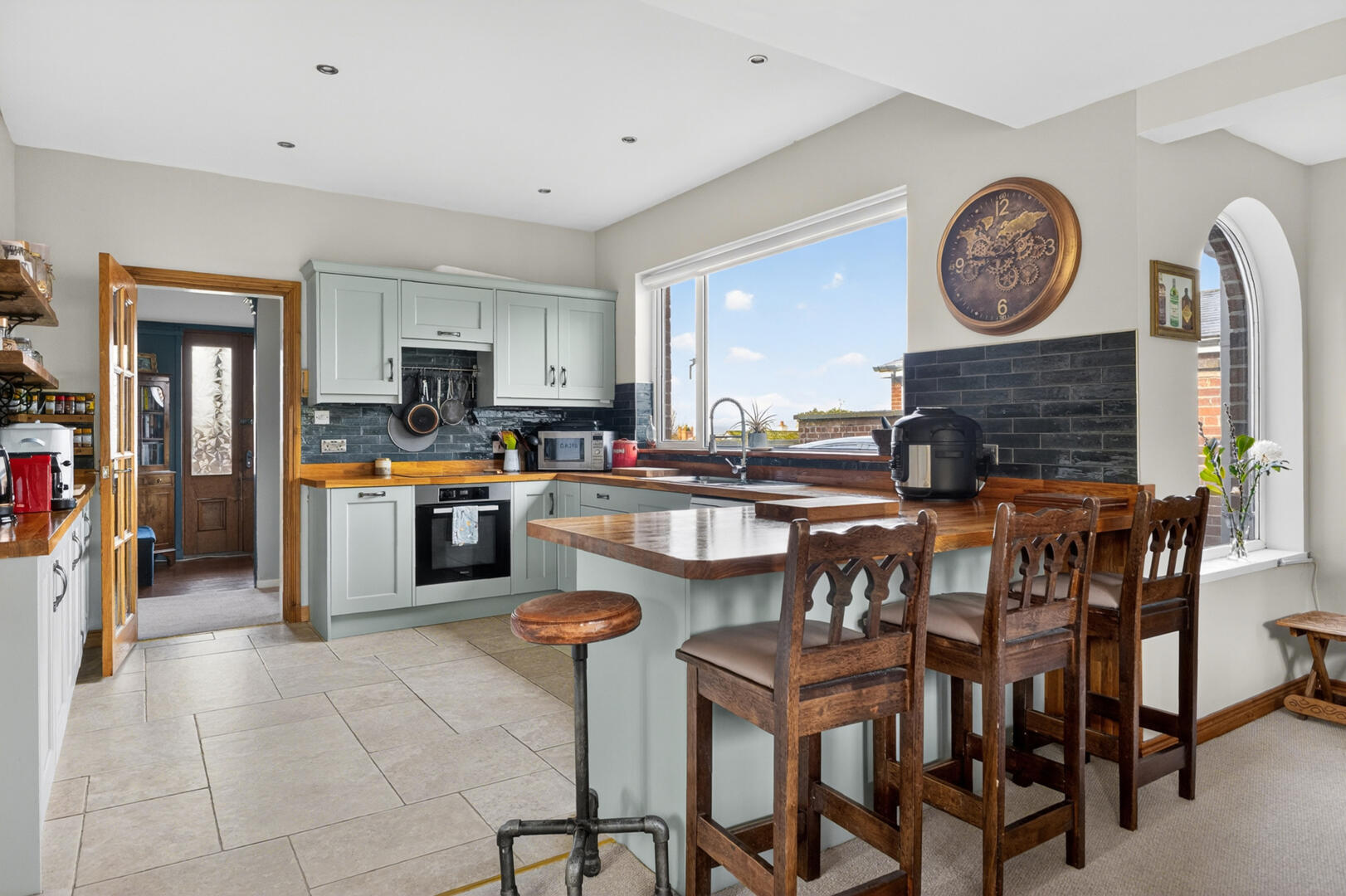 The heart of the home is the large open plan kitchen and dining area, fitted with an extensive range of units, timber worktops, and a central breakfast bar, all filled with natural light from rooflights and garden facing windows. A separate utility room provides additional storage.