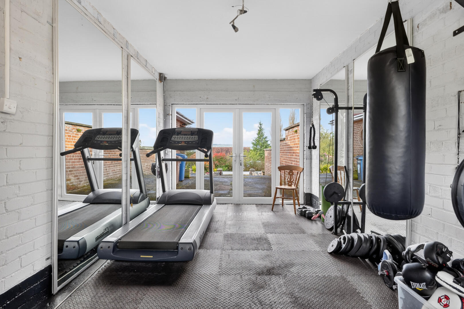 Private, sunny rear garden with a paved patio area and an attached garage currently in use as a home gym, offering excellent versatility
