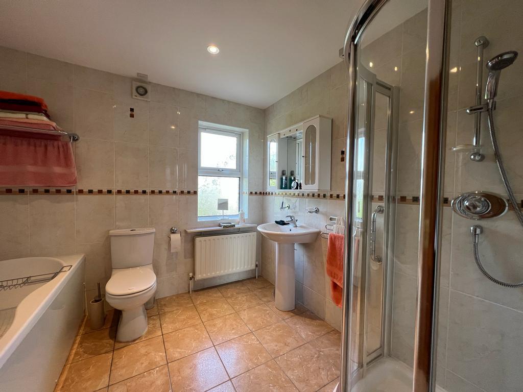 Comprising Jacuzzi style bath, walk in shower, whb and wc, recessed lighting, fully tiled walls and floor.