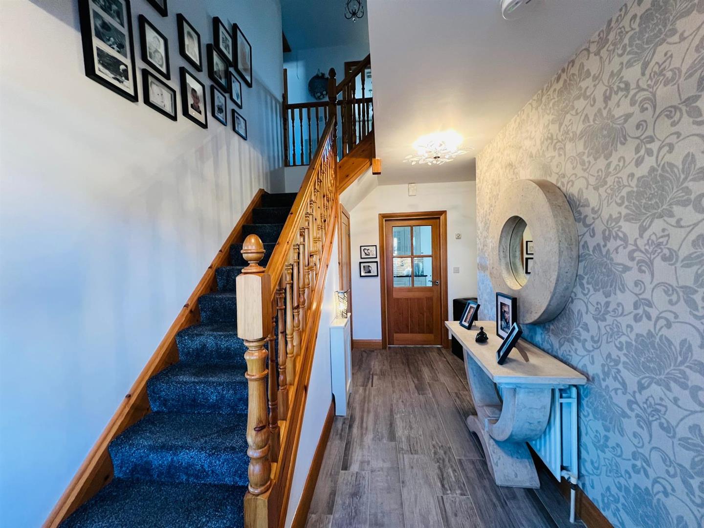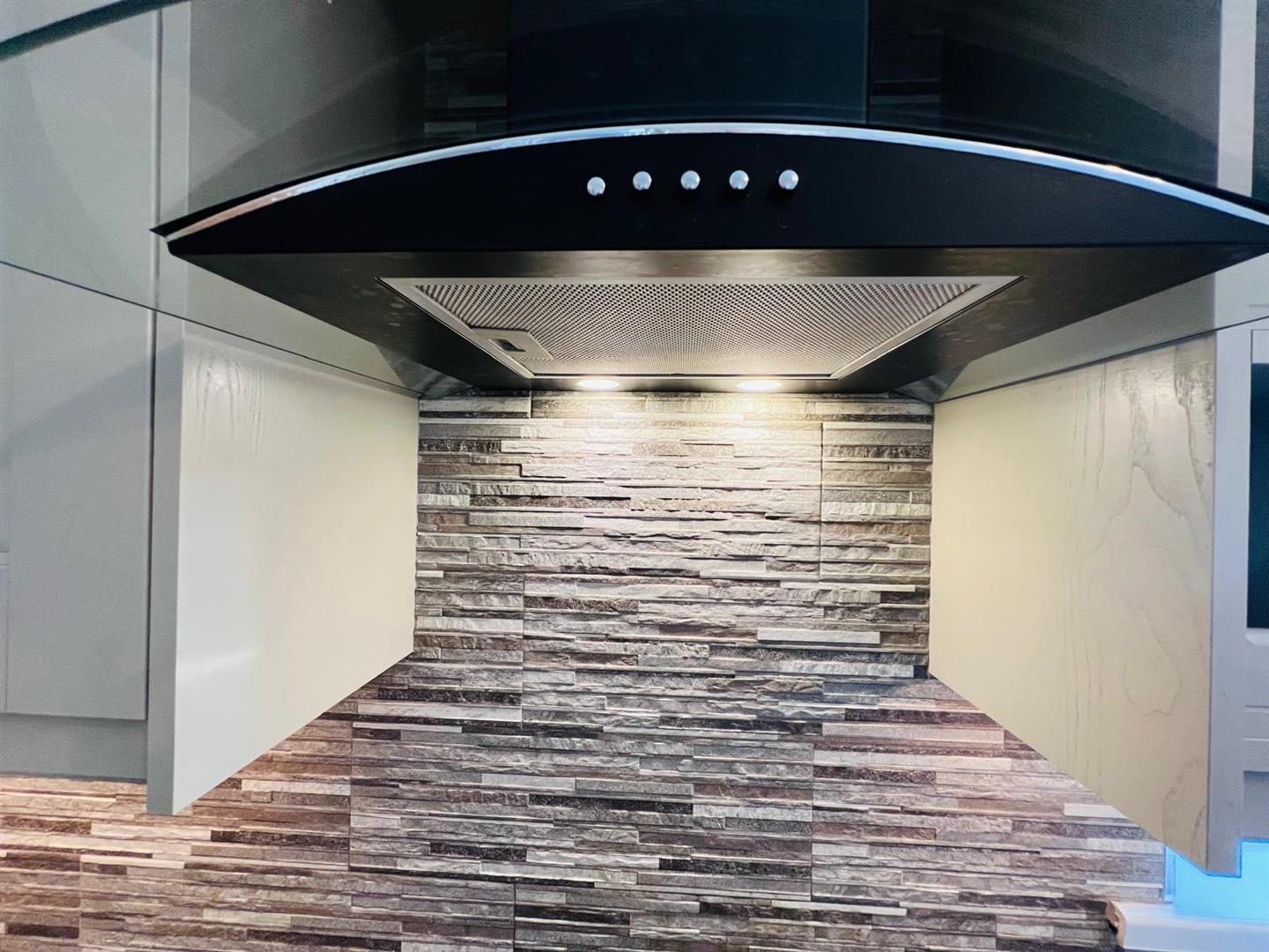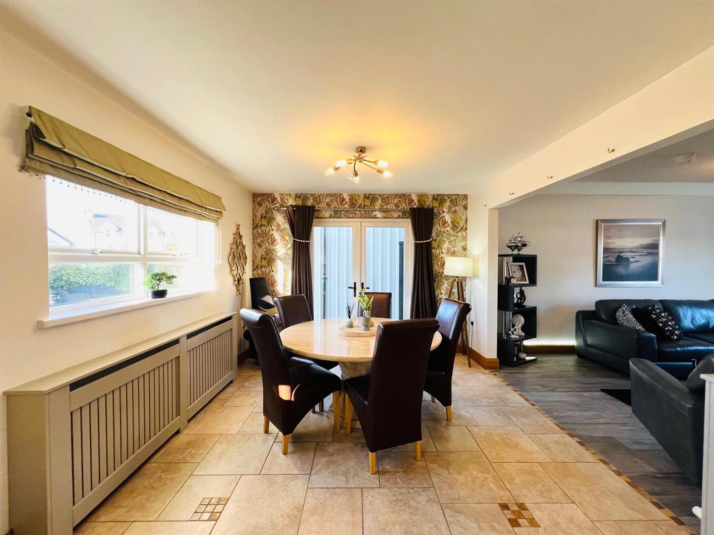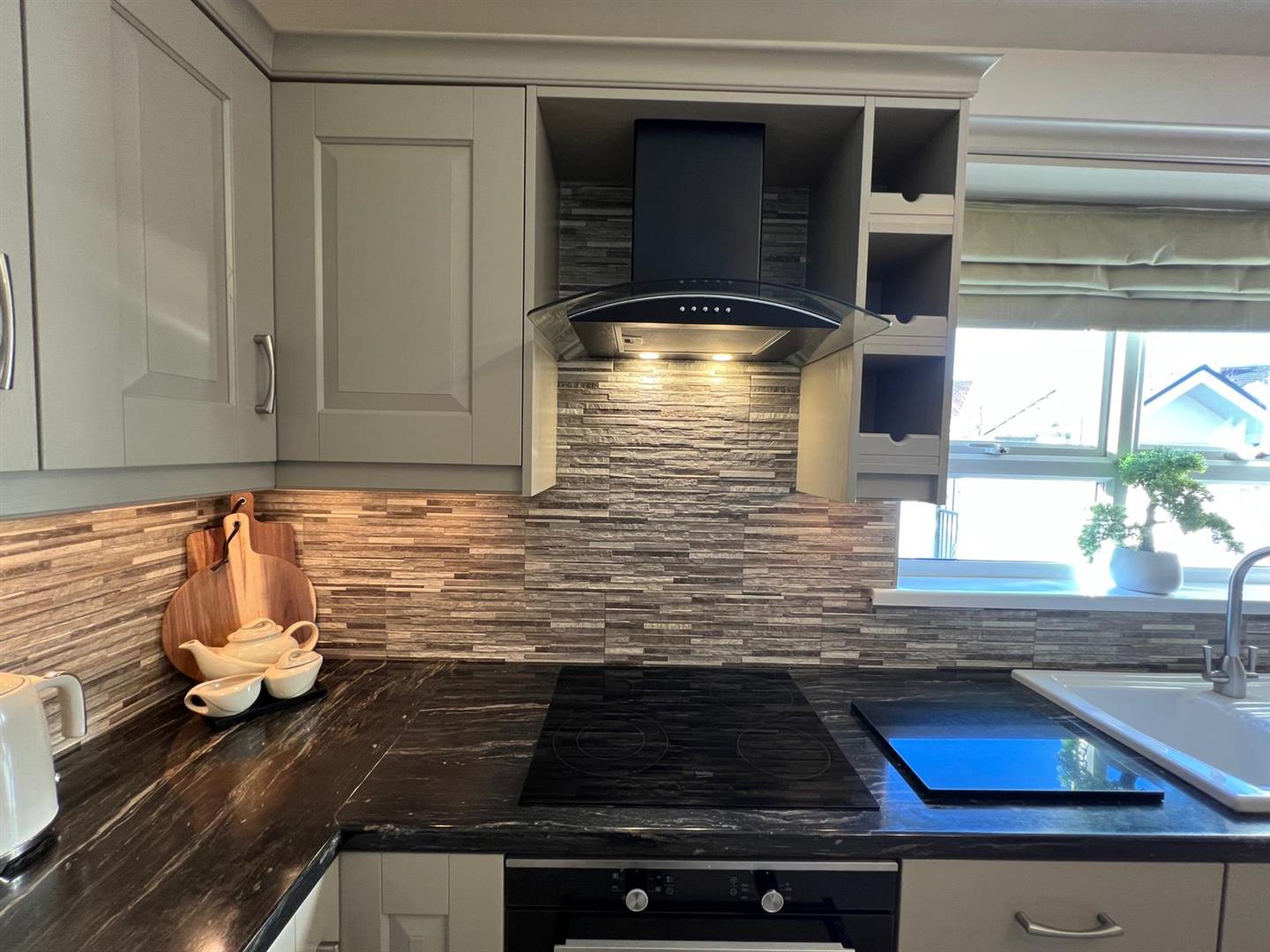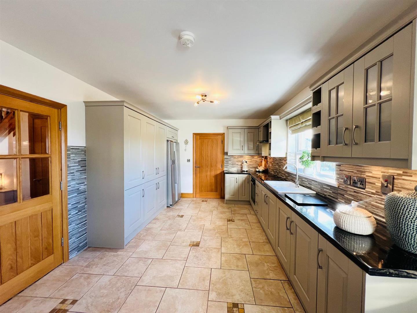 Having excellent range of eye and low level units, matching pelmet over window, tiling between units, hob and oven, extractor hood, space for fridge/freezer, wine rack, ample dining space, tiled floor, French doors to side.