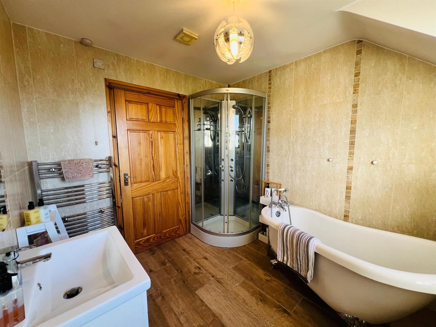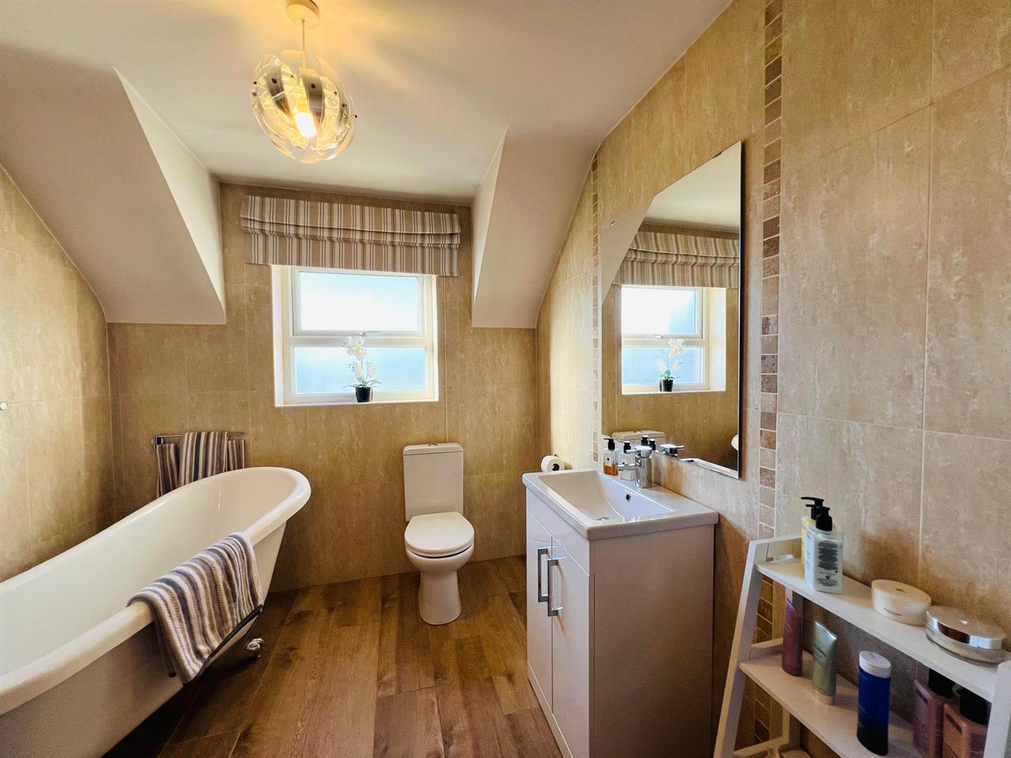 Comprising free standing bath, whb set in vanity unit, wc, fully tiled walls and tiled floor.