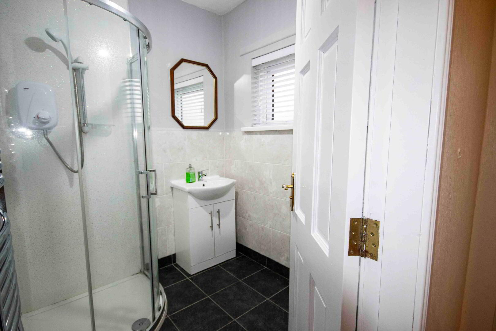 Hallway, living room, kitchen & bathroom with electric shower