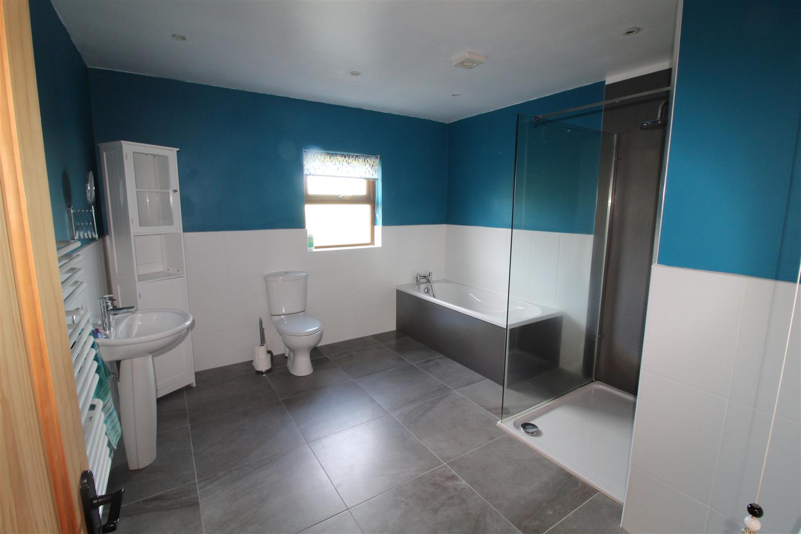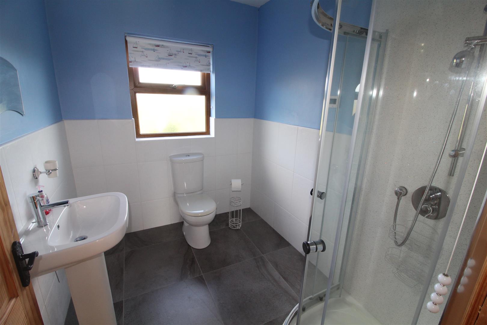 Shower cubicle with wall shower, low flush w.c. and pedestal wash hand basin. Tiled floor. Part tiled walls. Underfloor heating.