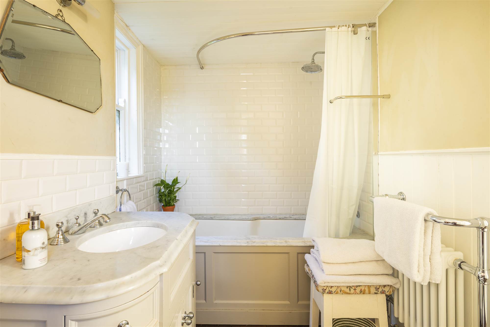 A well-appointed family bathroom located on a split-level landing, includes an early Victorian WC, sympathetic to the historic character of the house.