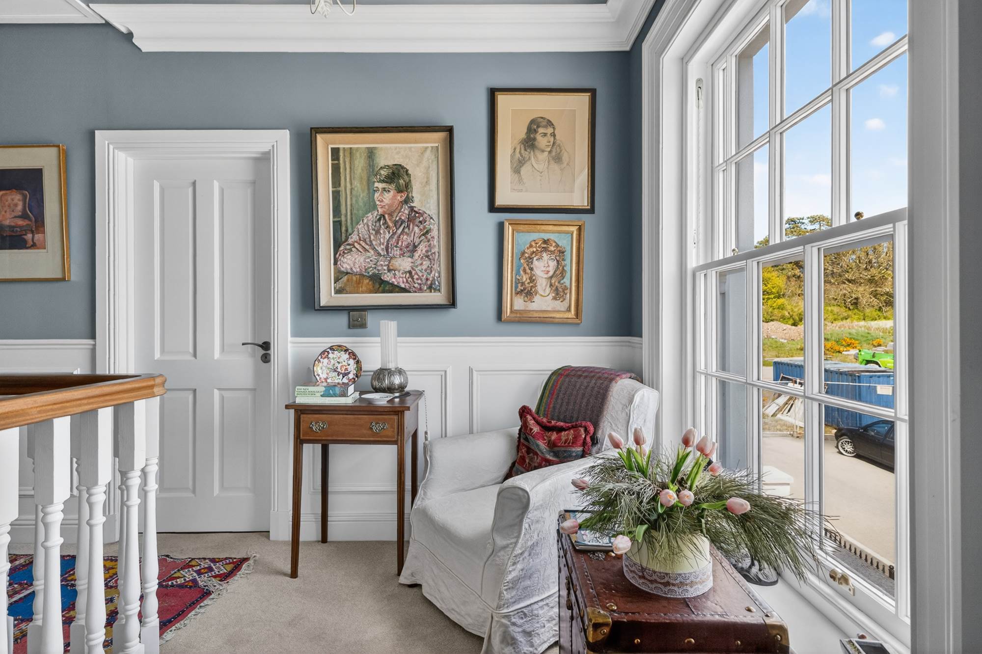 immediate impression, with its tall sliding sash windows, ornate fanlight, and a