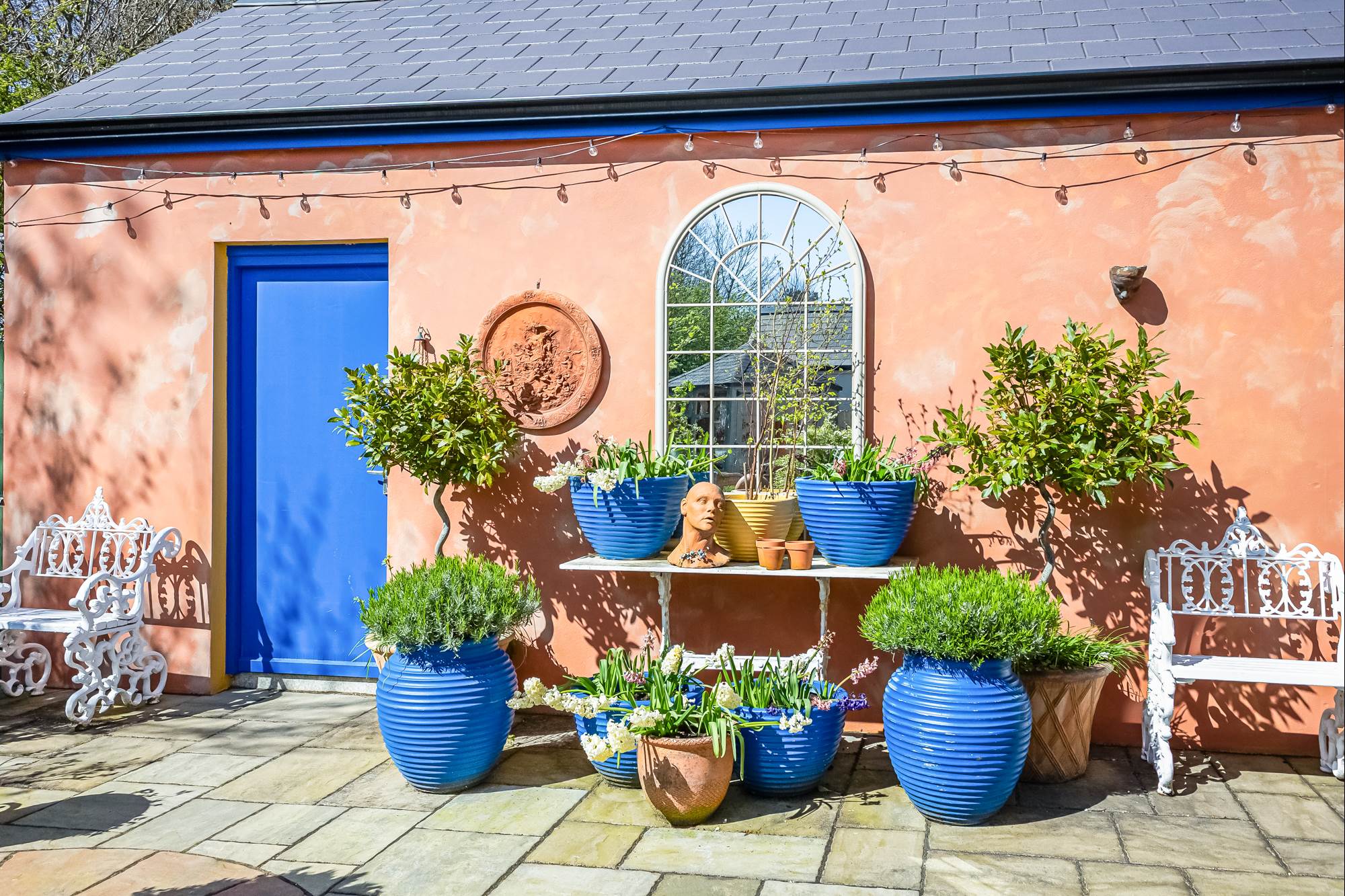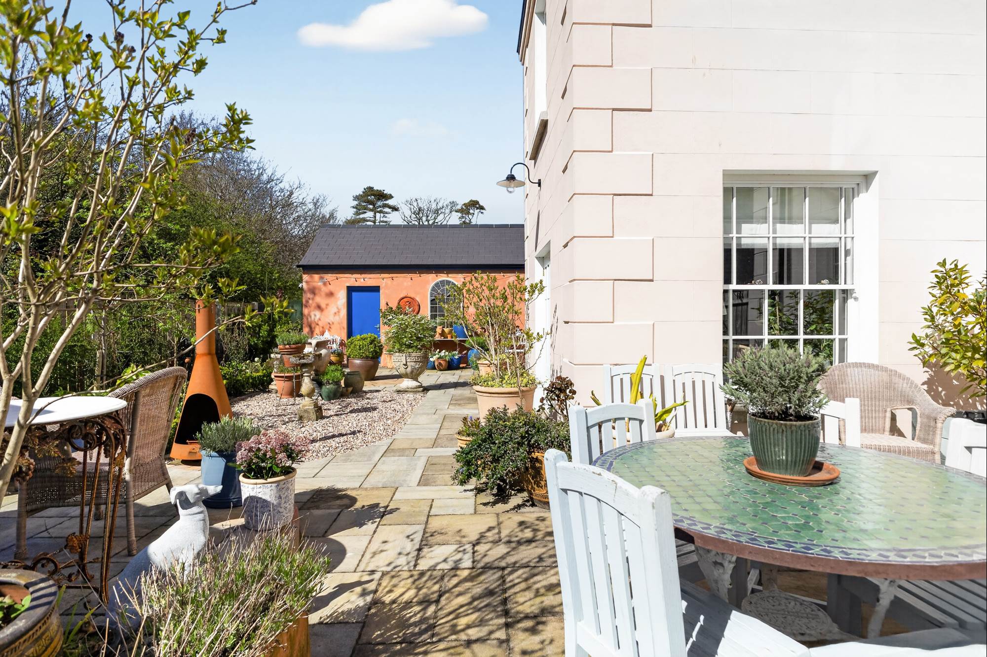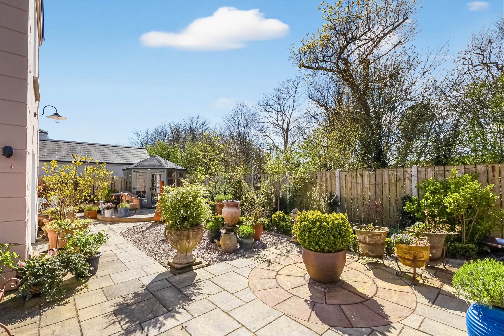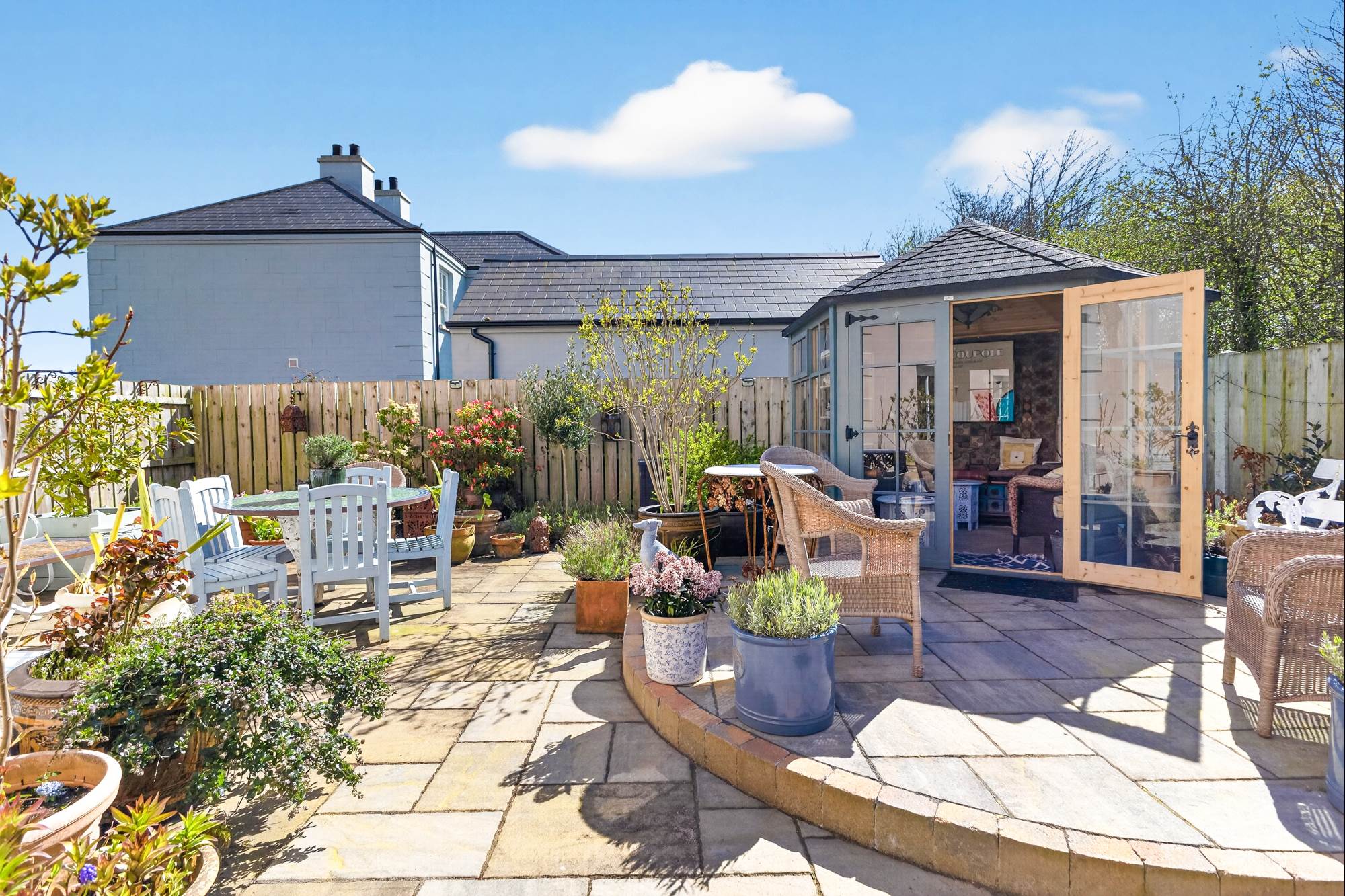 low-maintenance entertaining space, while a charming summerhouse offers a