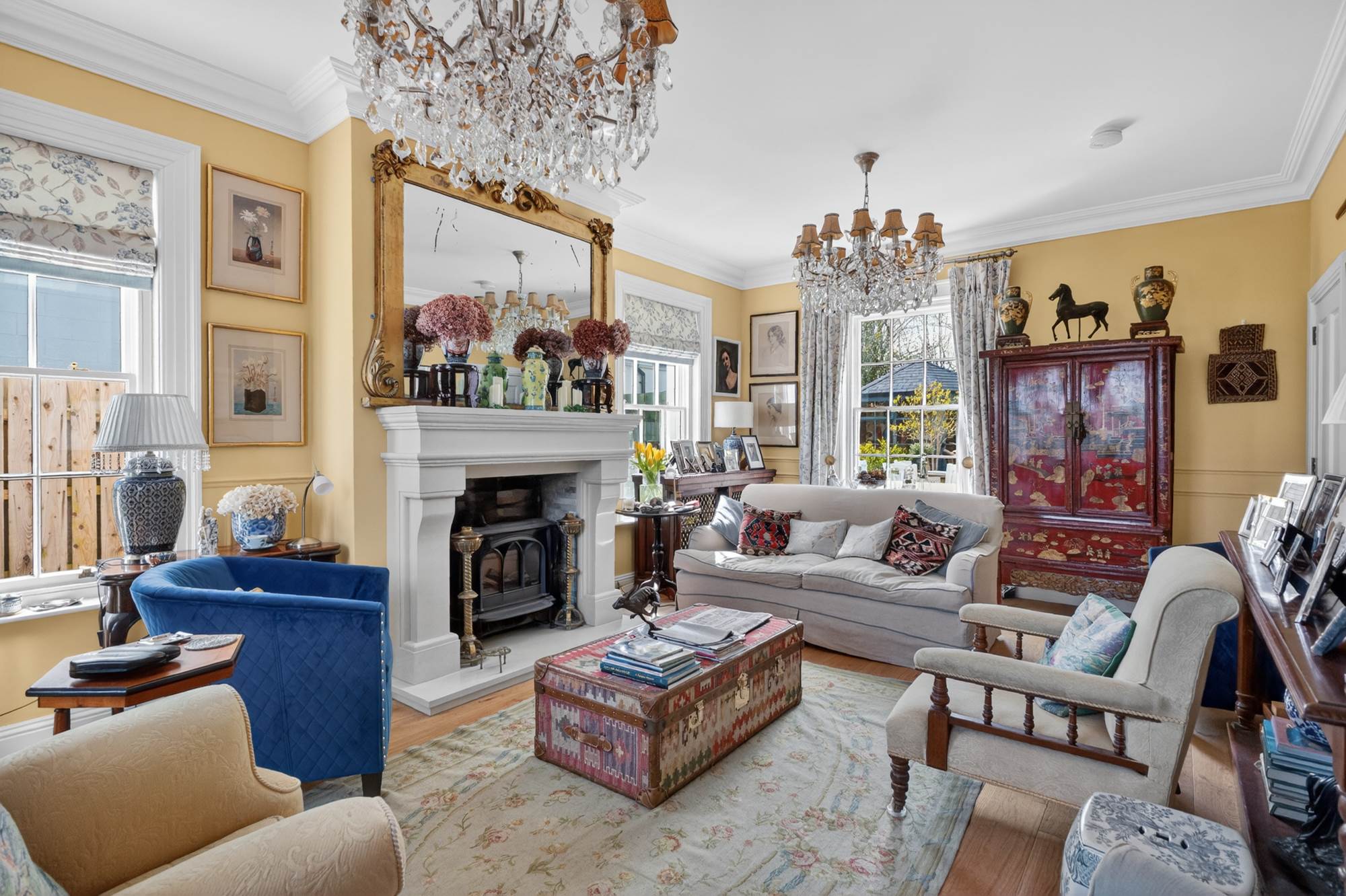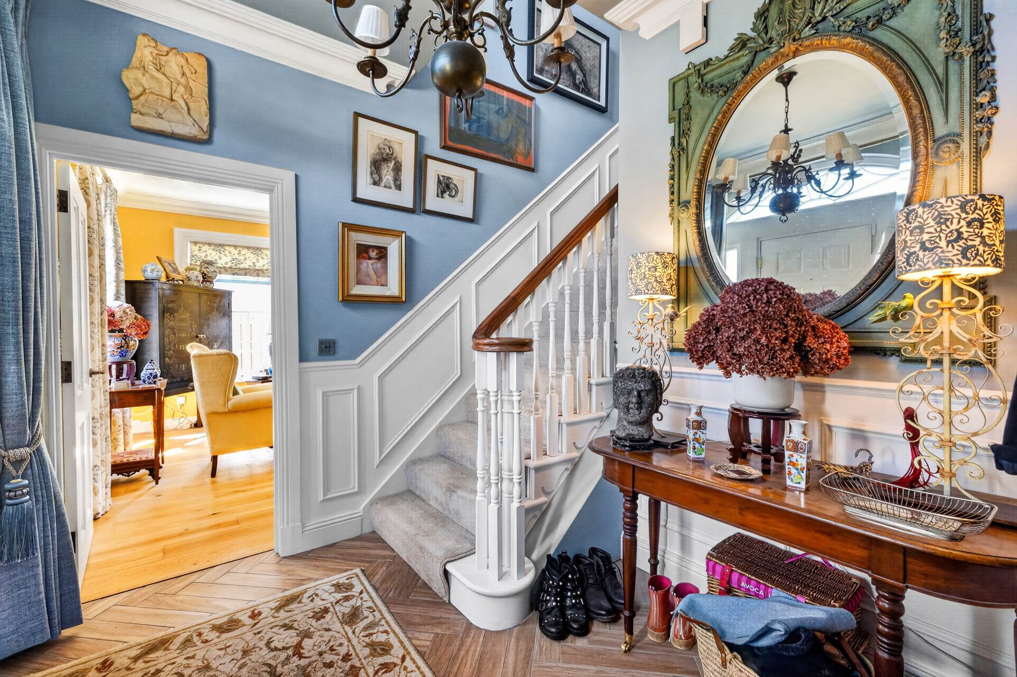 overhead, ornate cornices draw the eye, and intricate panelling adds depth and