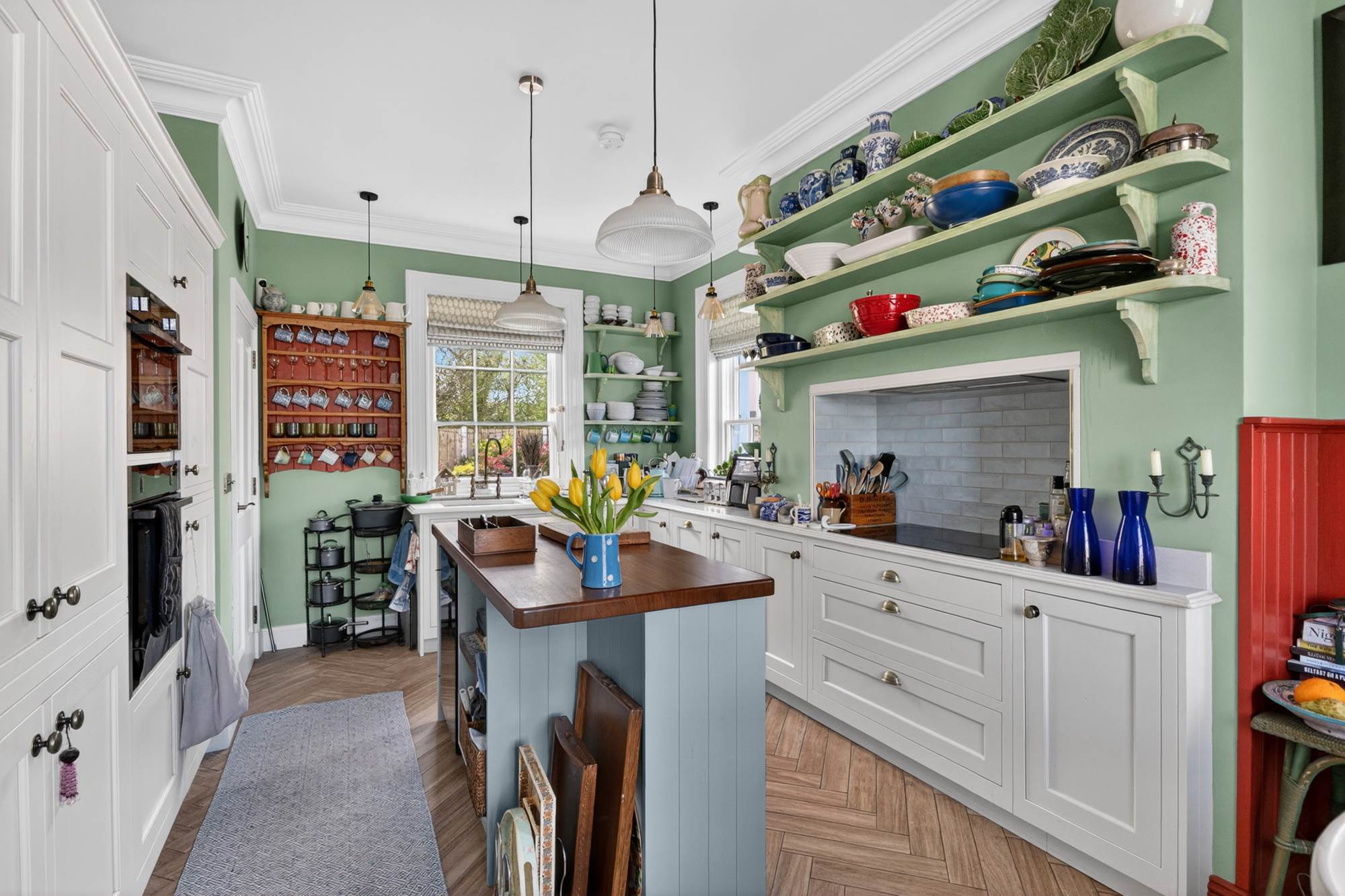 featuring bespoke cabinetry in muted heritage tones, luxurious quartz &