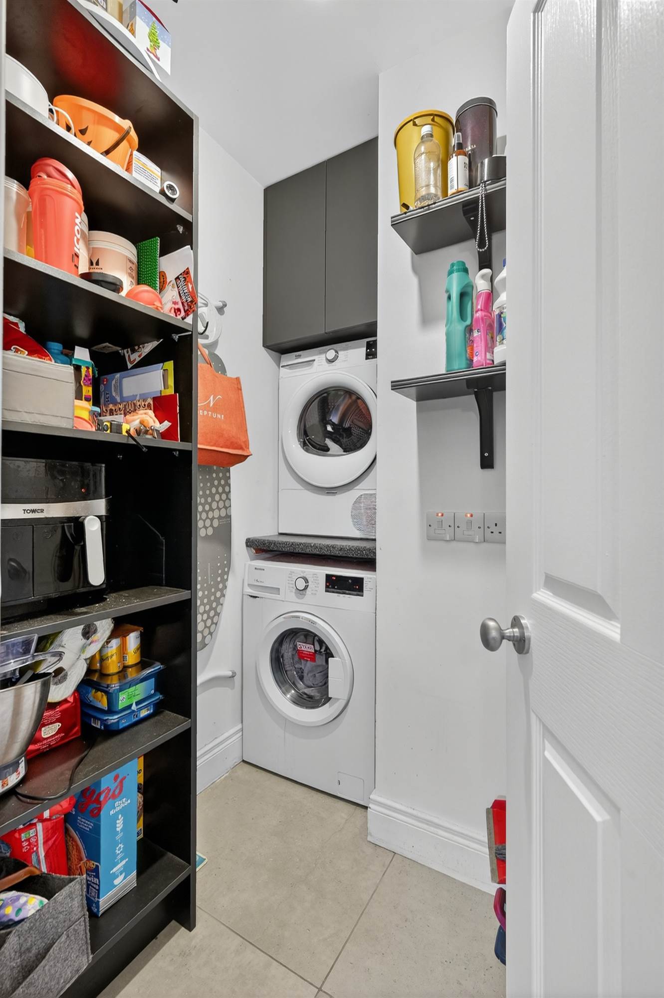 (at widest points). Work surfaces, plumbed for washing machine, space for tumble dryer, ceramic tiled floor, extractor fan.