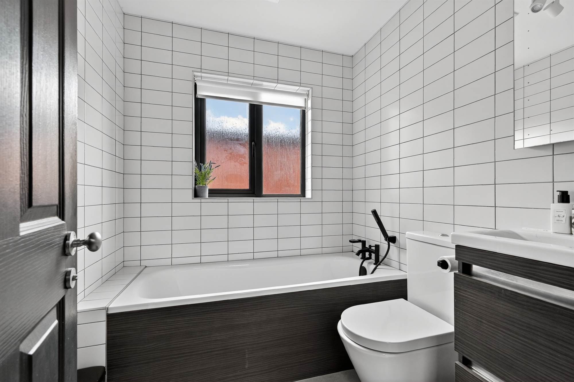 White suite comprising low flush wc, vanity unit with wash hand basin, panelled bath with hand shower, fully tiled shower cubicle with drencher shower head, fully tiled walls, ceramic tiled floor, extractor fan.
