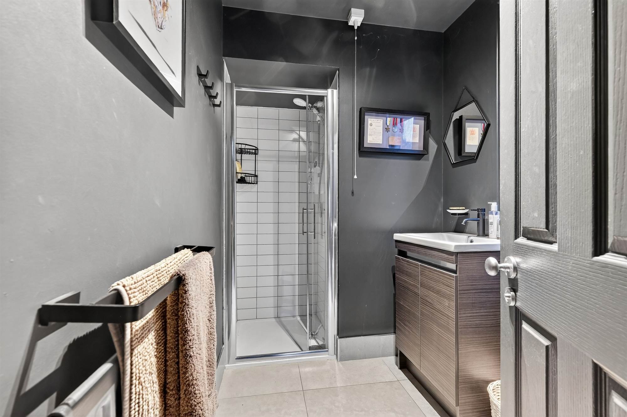 White suite comprising low flush wc, vanity unit with wash hand basin, fully tiled shower cubicle with electric shower, porcelain tiled floor, extractor fan.