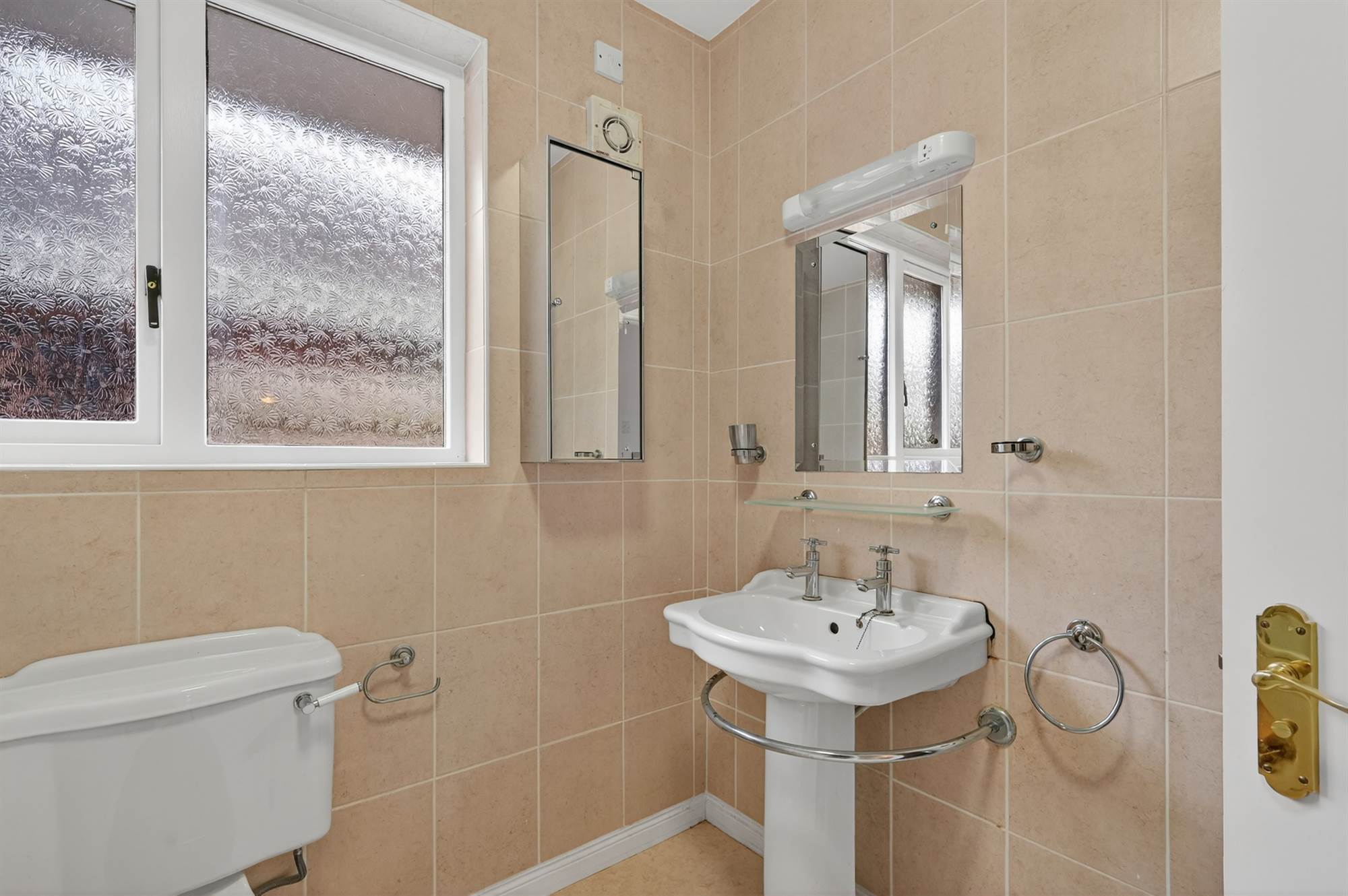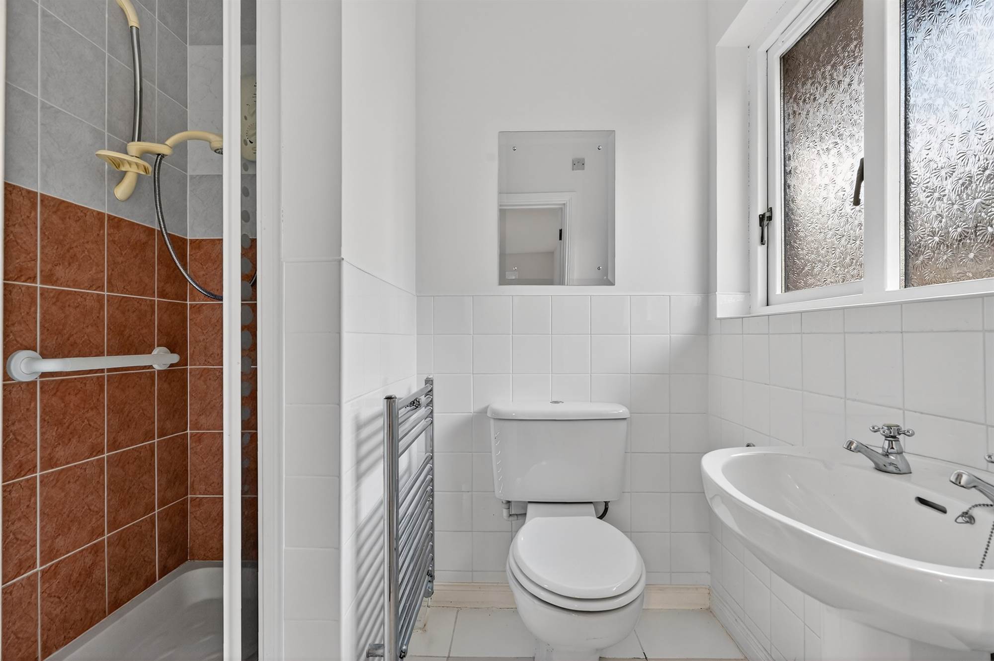 Low flush wc, pedestal wash hand basin, panelled bath with shower over, heated towel rail, fully tiled walls.