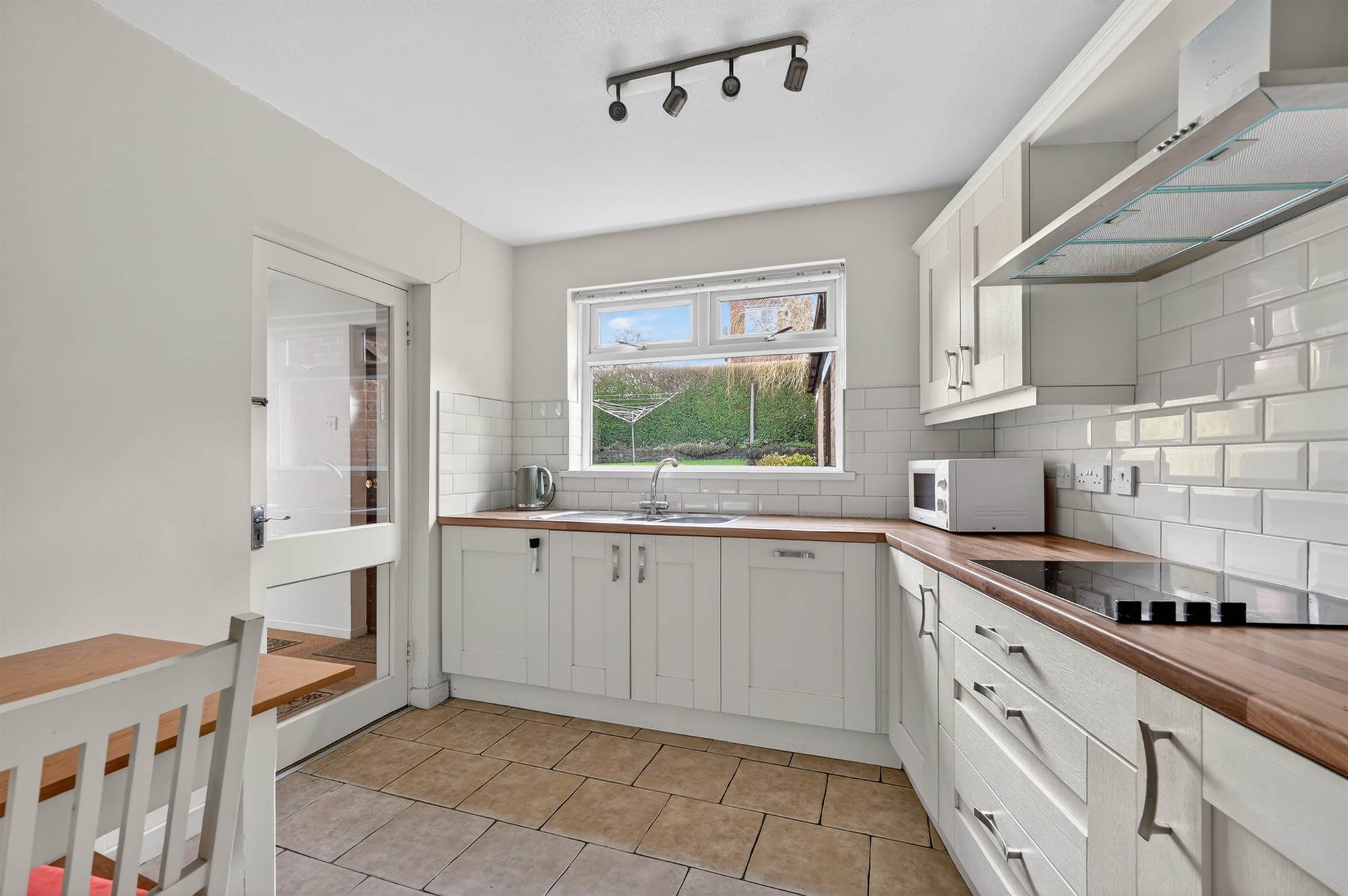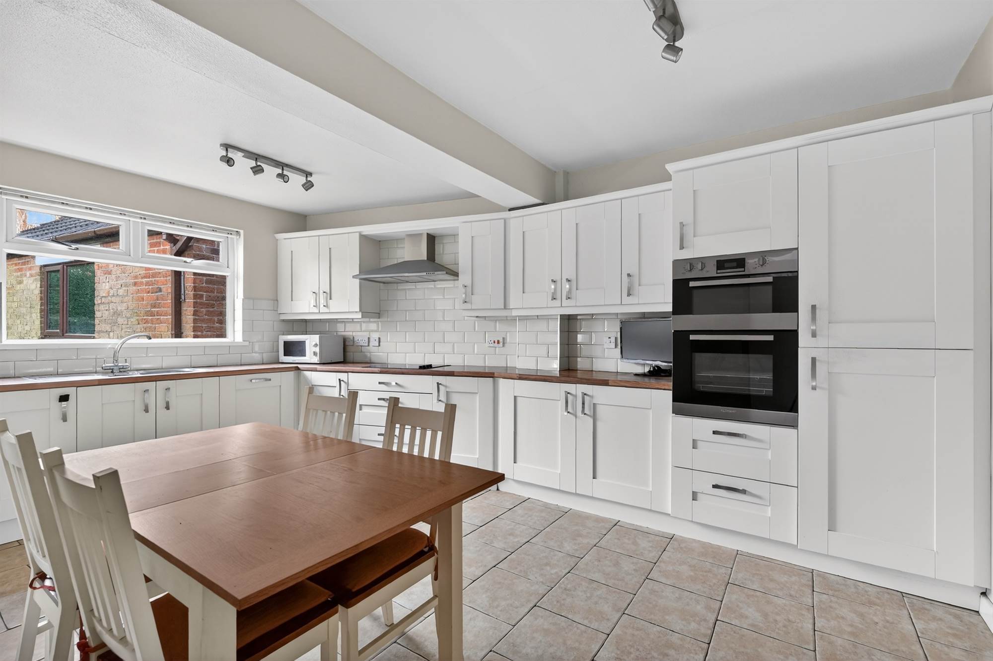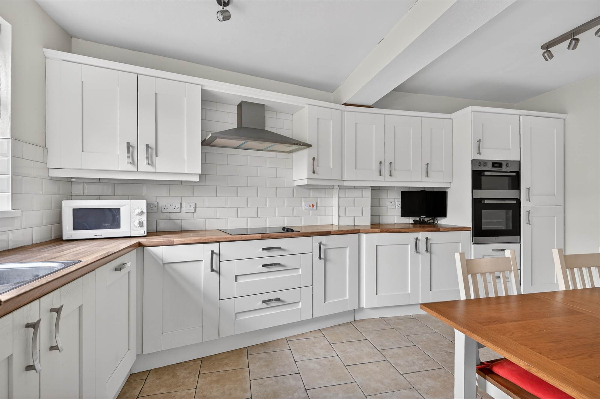 Range of high and low level units, wooden work surfaces, one and a half bowl stainless steel double sink unit, integrated hob, stainless steel extractor fan over, integrated Candy double oven, integrated dishwasher, integrated washing machine, part tiled walls, ceramic tiled floor. Glazed door to rear hall.