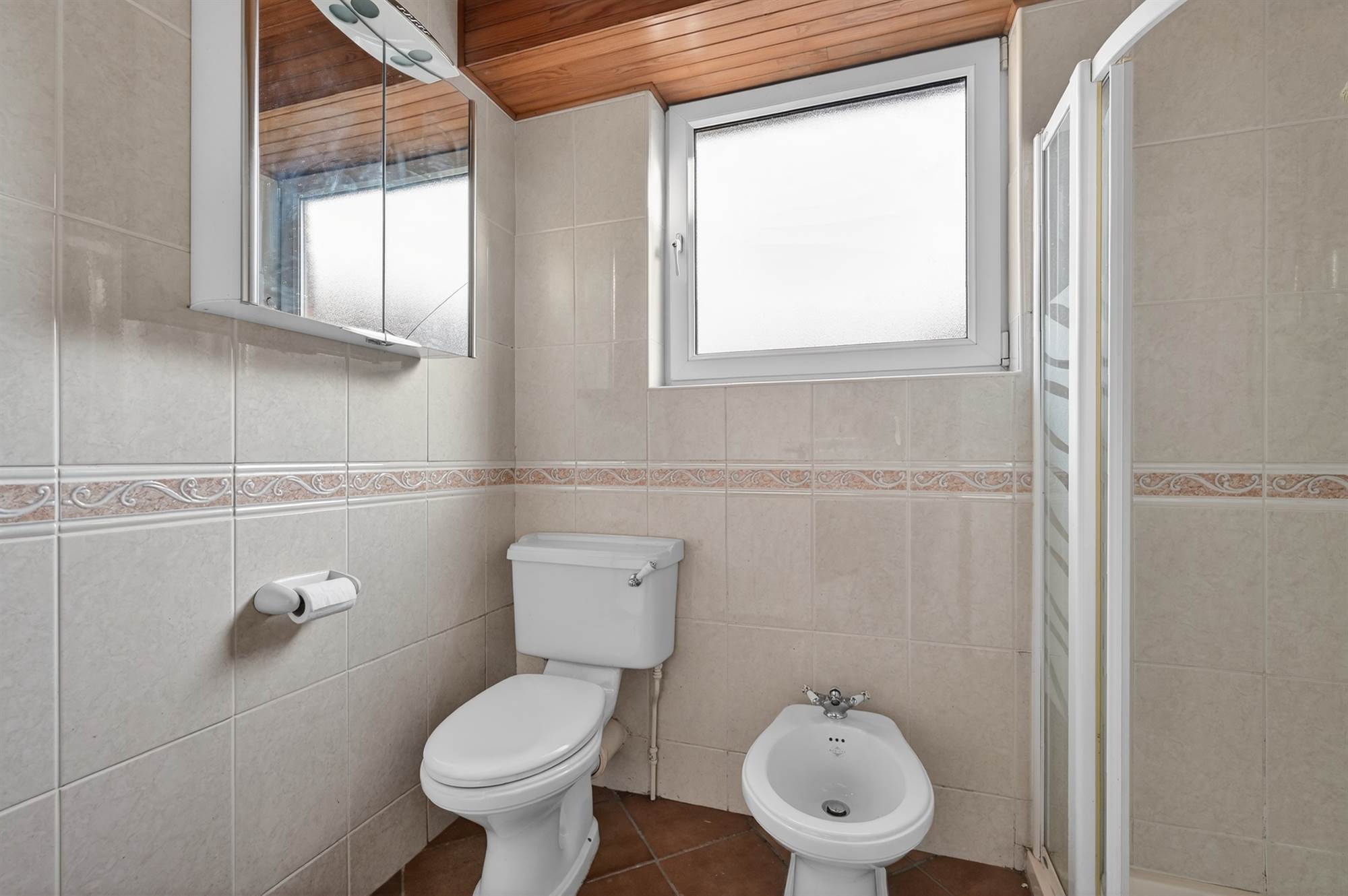 White suite comprising low flush wc, bidet, pedestal wash hand basin, fully tiled shower cubicle with electric shower, fully tiled walls, ceramic tiled floor, tongue and groove ceiling, low voltage spotlights, hotpress.
