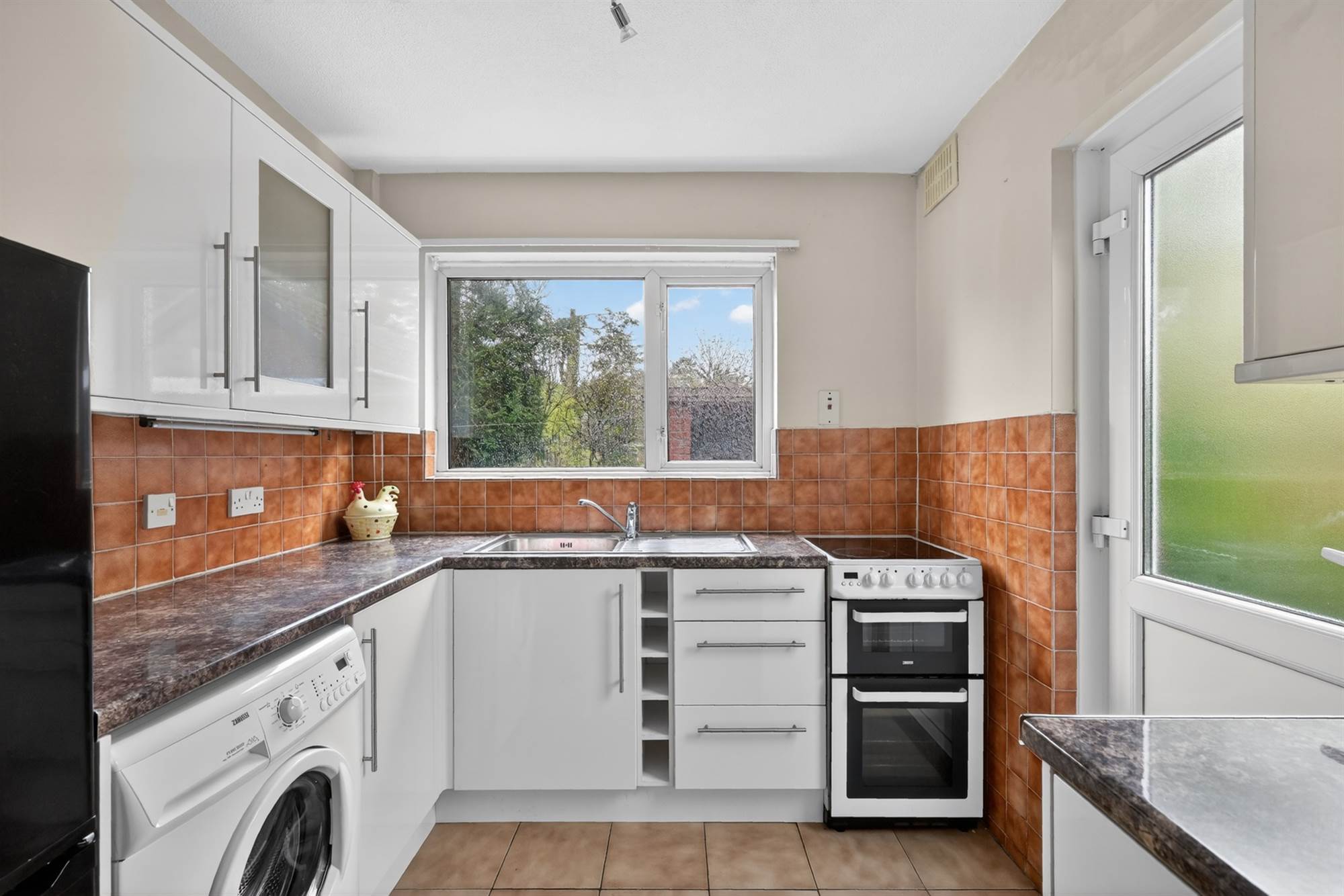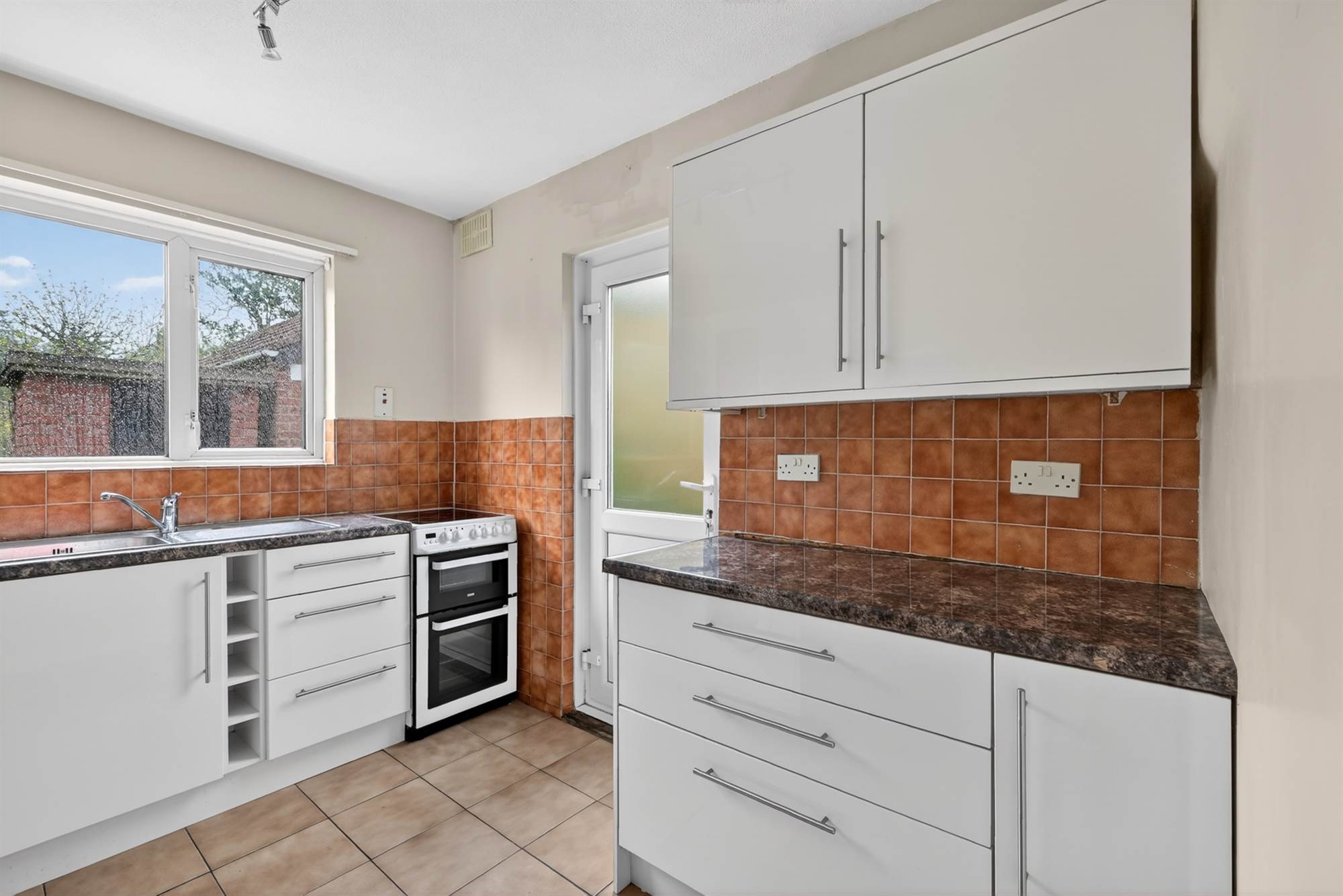 At widest points. High gloss range of high and low level units, work surfaces, single drainer stainless steel sink unit, integrated wine rack, space for cooker, space for fridge/freezer, plumbed for washing machine, part tiled walls, ceramic tiled floor, upvc door to rear.