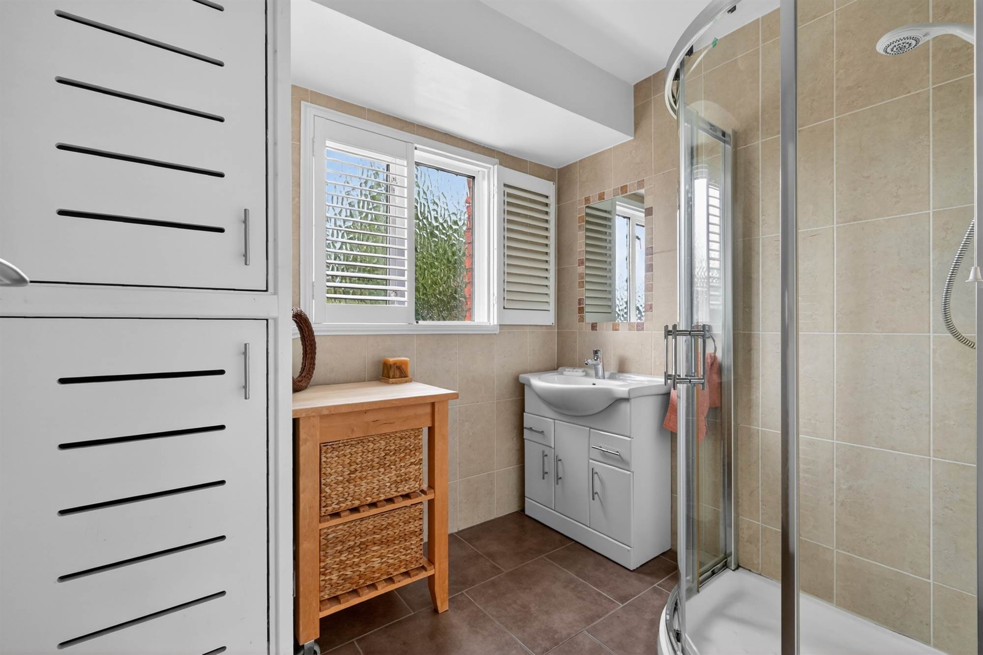 White suite comprising vanity unit with wash hand basin, fully tiled shower cubicle with electric shower, part tiled walls, ceramic tiled floor, window shutters, hotpress, gas boiler, heated towel rail.