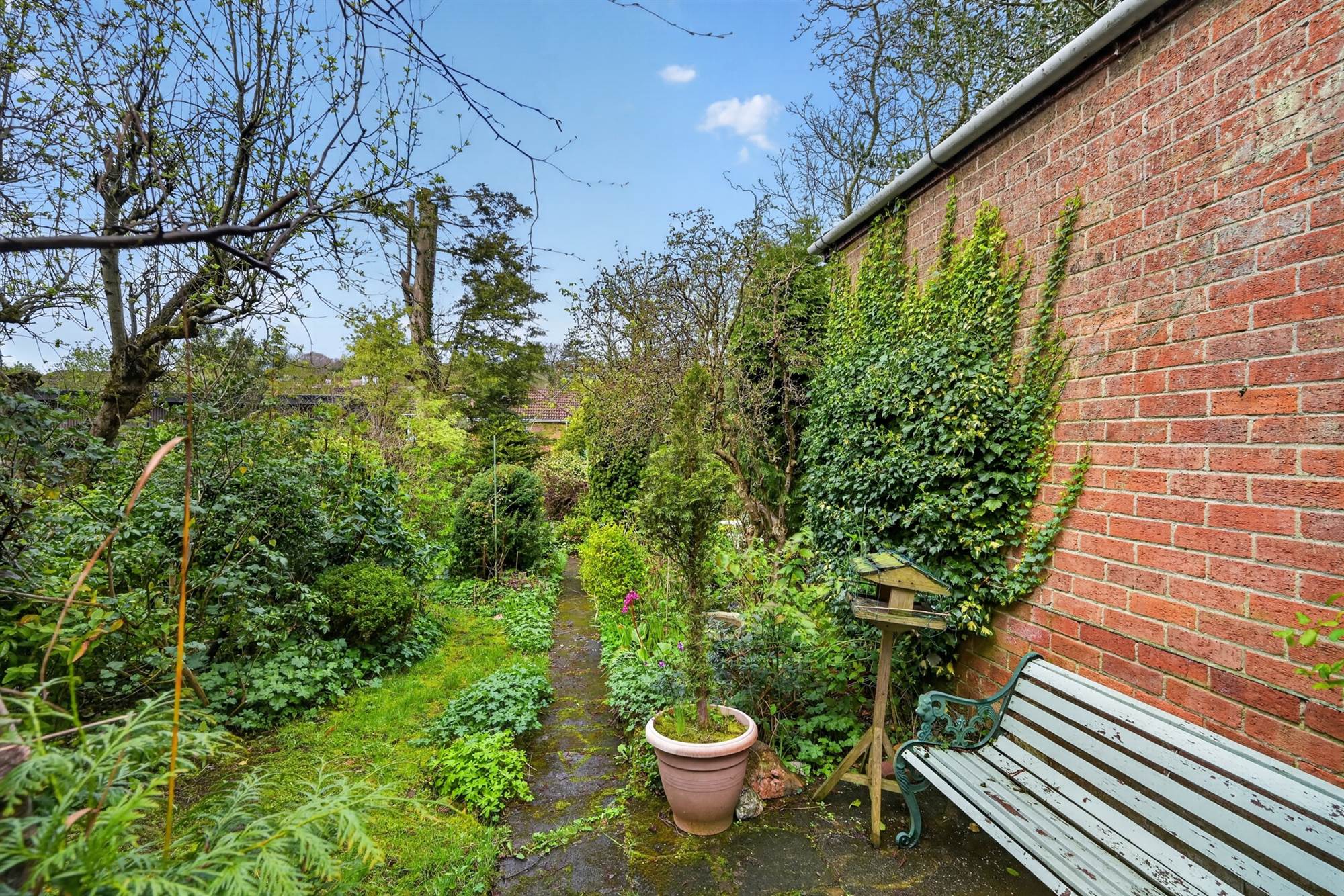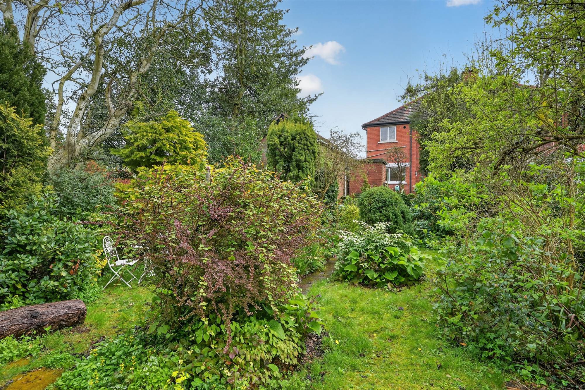 Gated driveway parking. Front garden in beds with shrubs and bushes. Excellent sized mature rear garden with various bushes, trees and hedging, paved patio area, garden store.