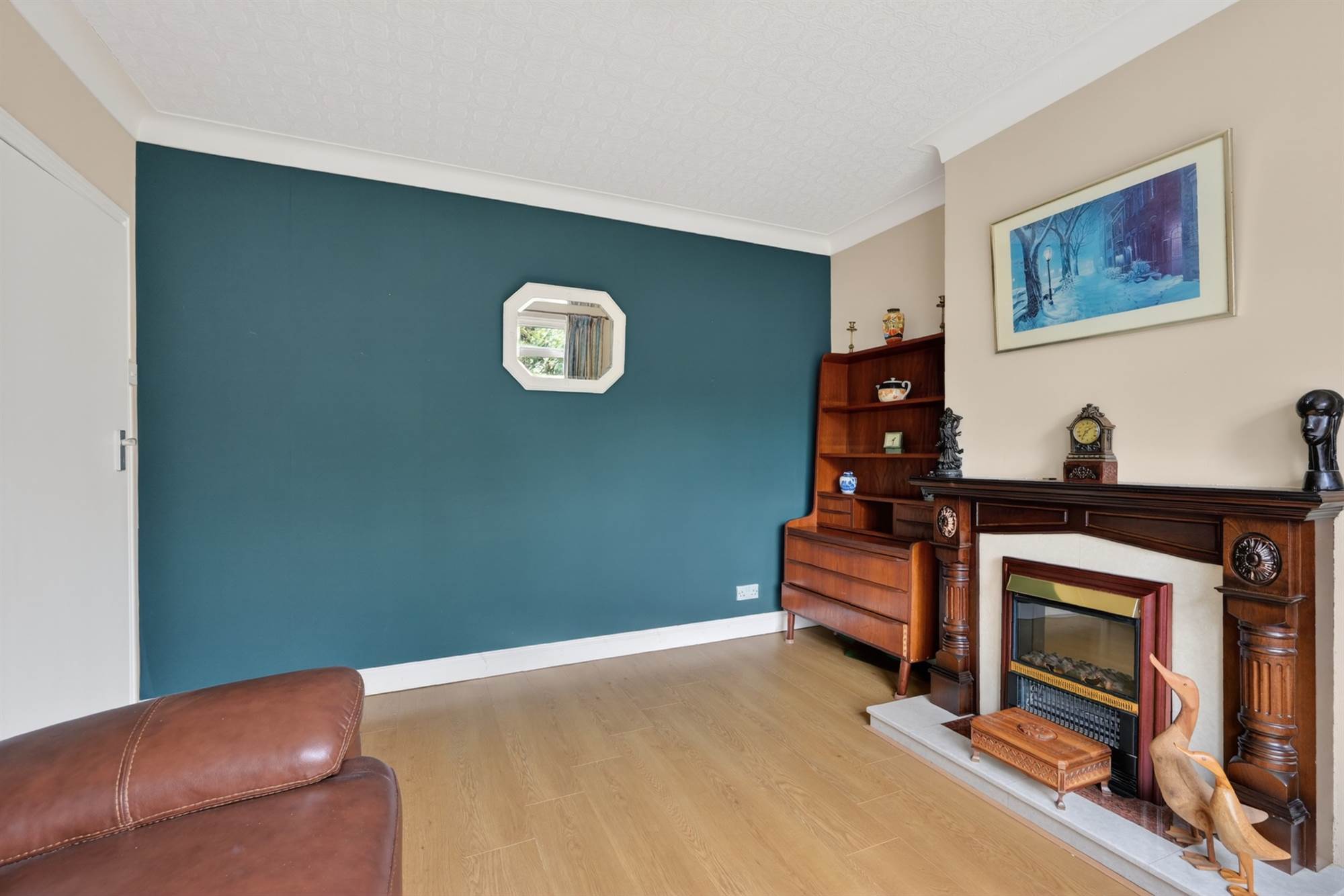 At widest points. Attractive feature fireplace with marble inset and hearth, cornice ceiling, laminate wood effect flooring.